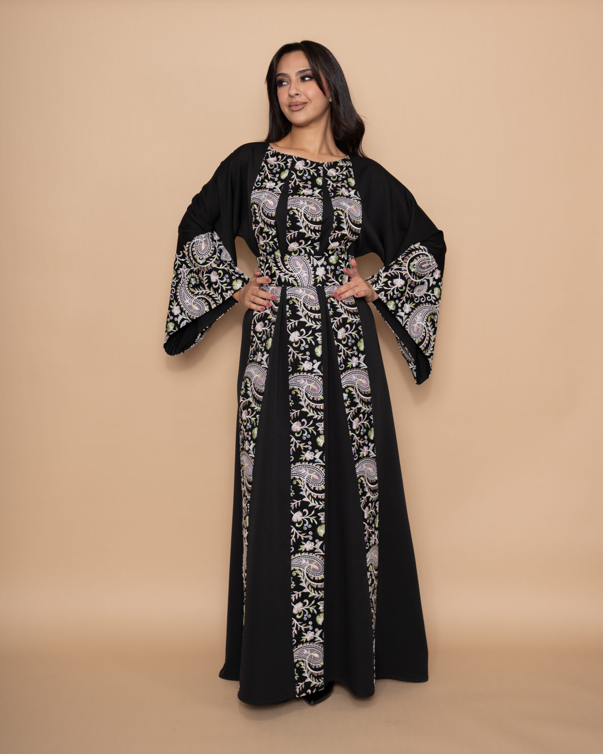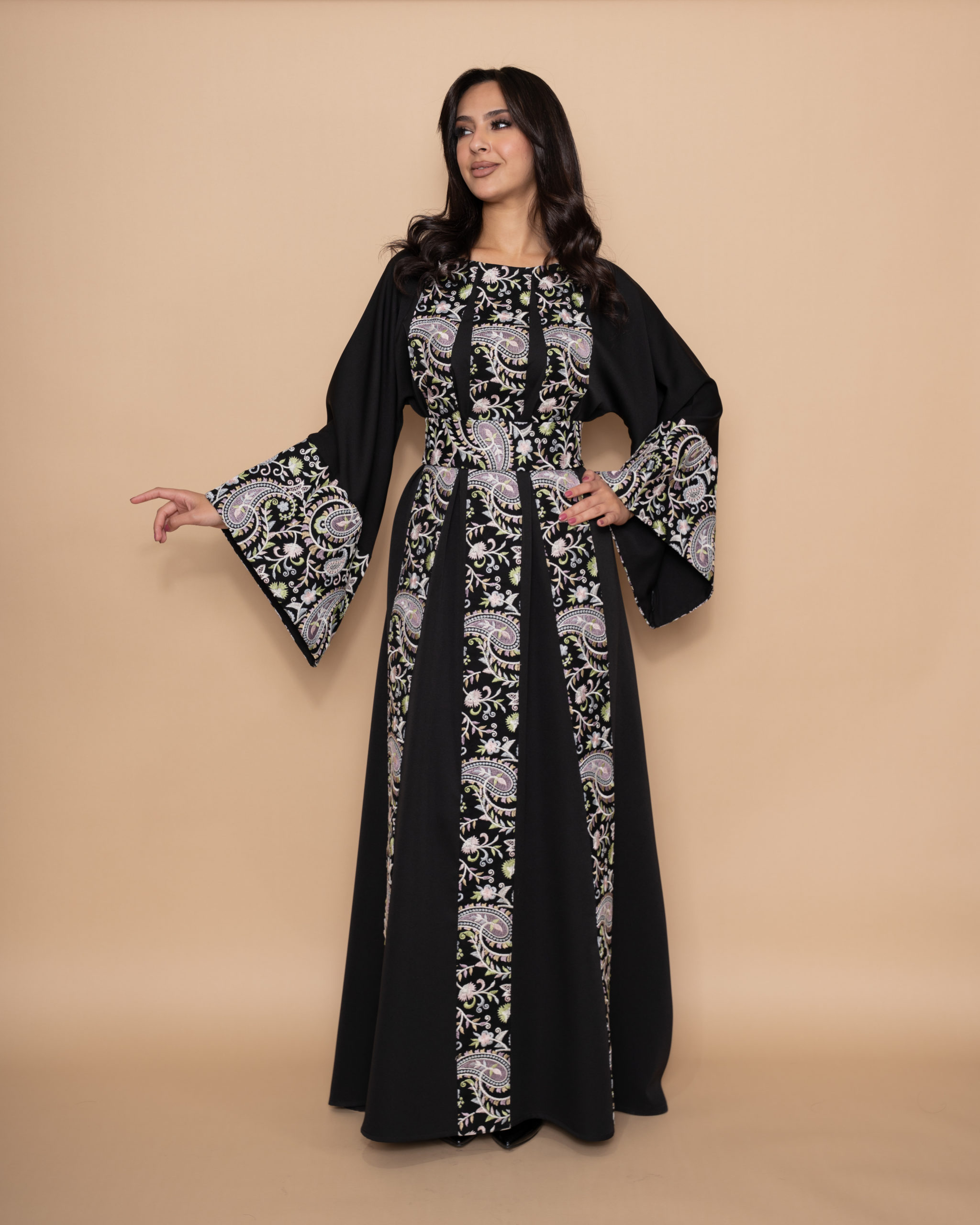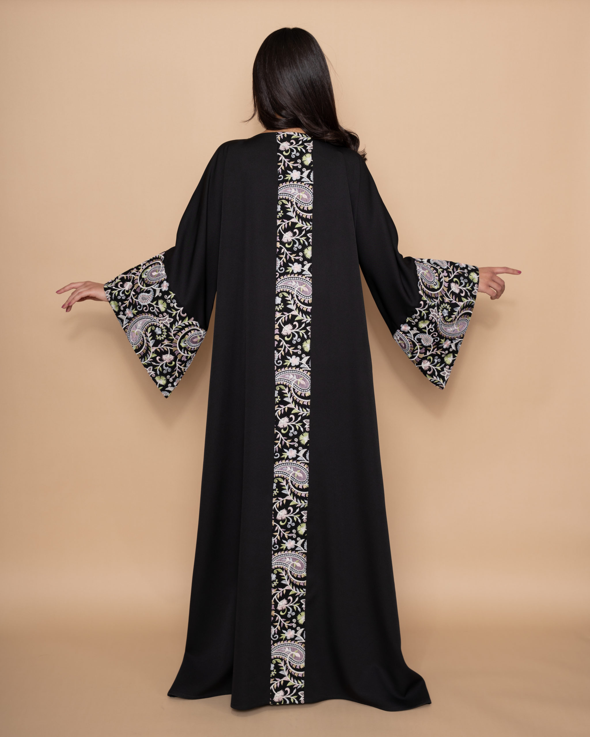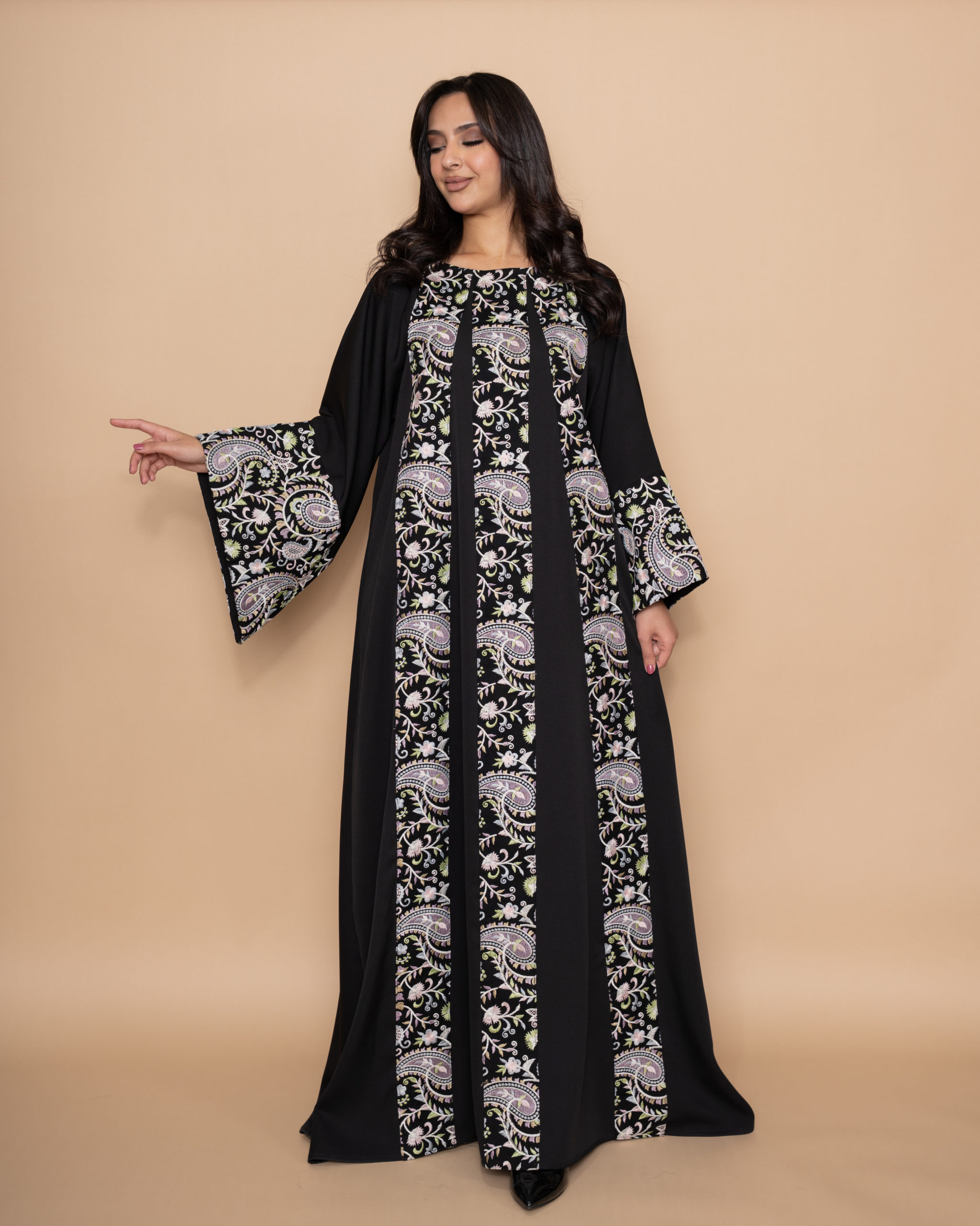 A beautiful black crepe maxi dress with bell-shaped sleeves and belt. Designed with three vertical lines on the front and one on the back, elegantly embroidered with a soft pastel palette of blue, purple, pink and white Buta patterns.