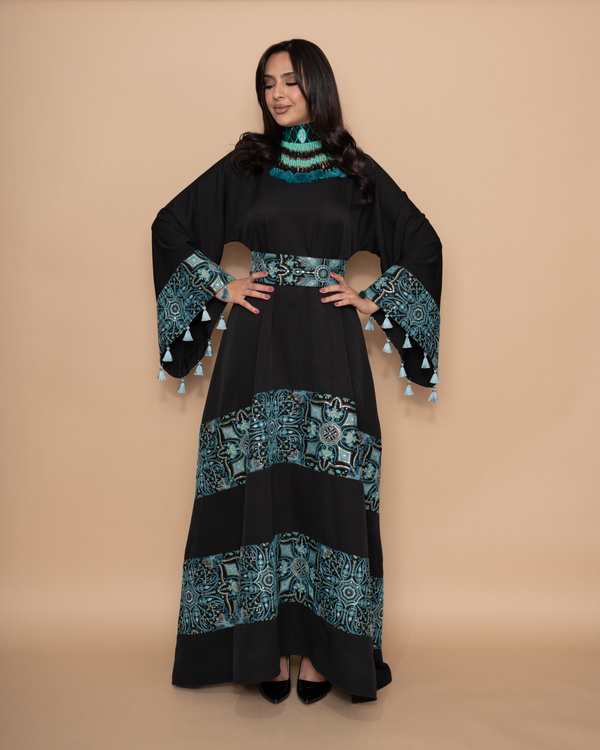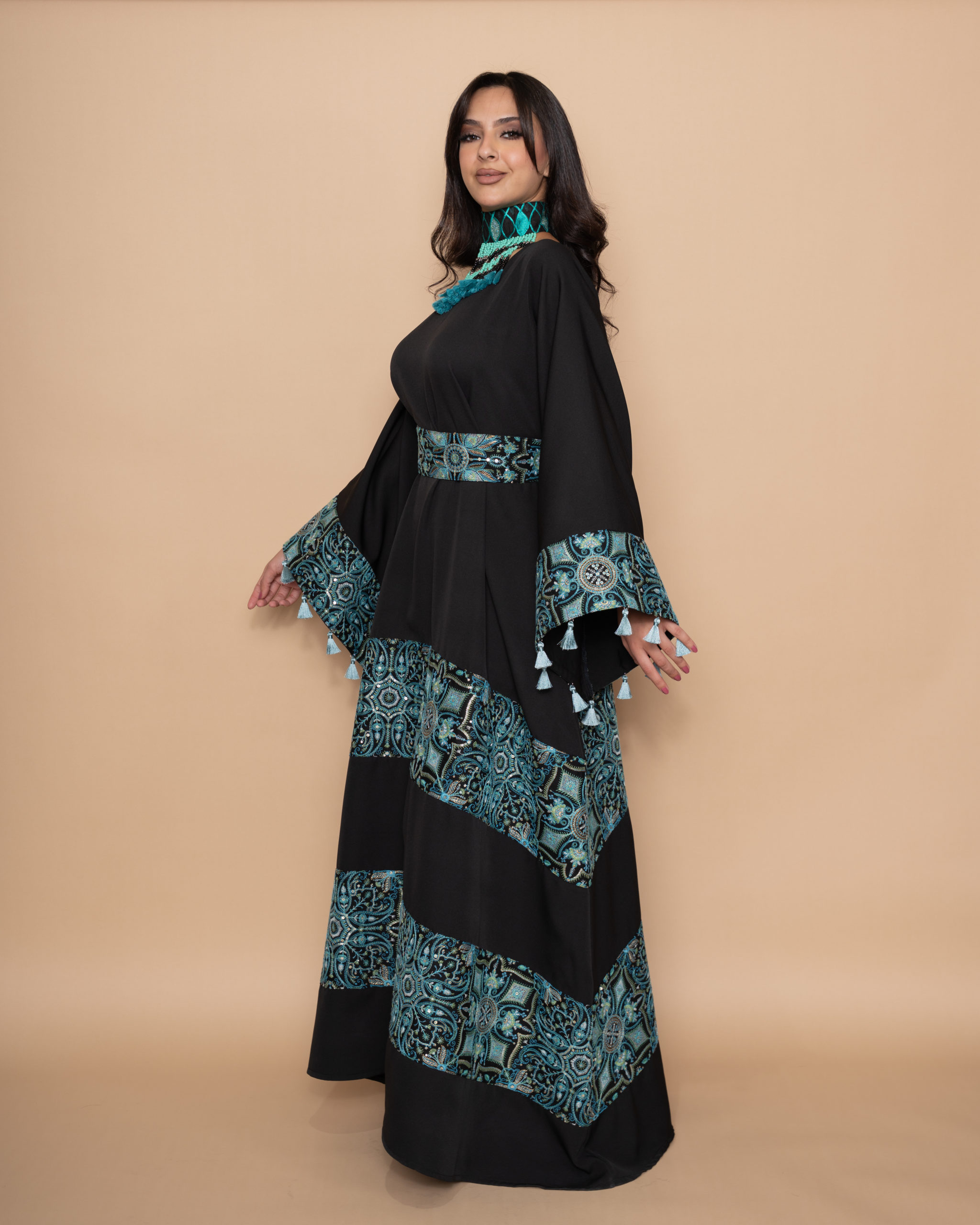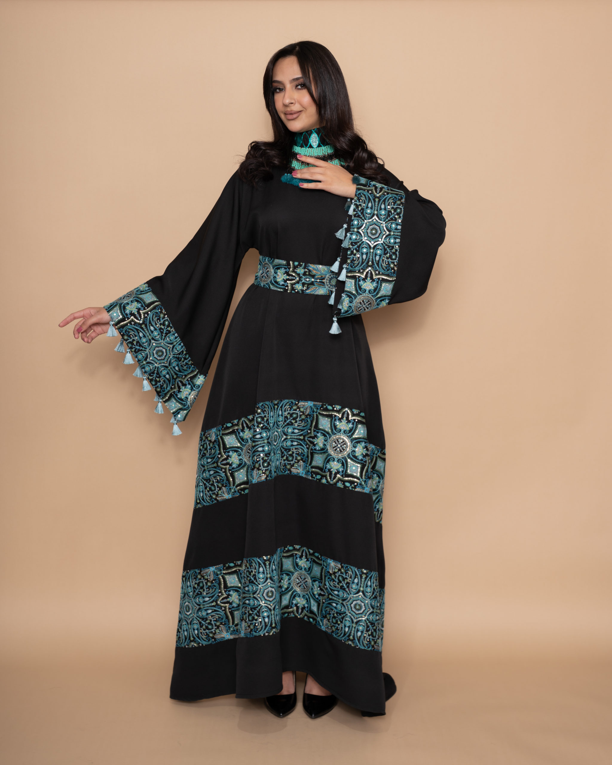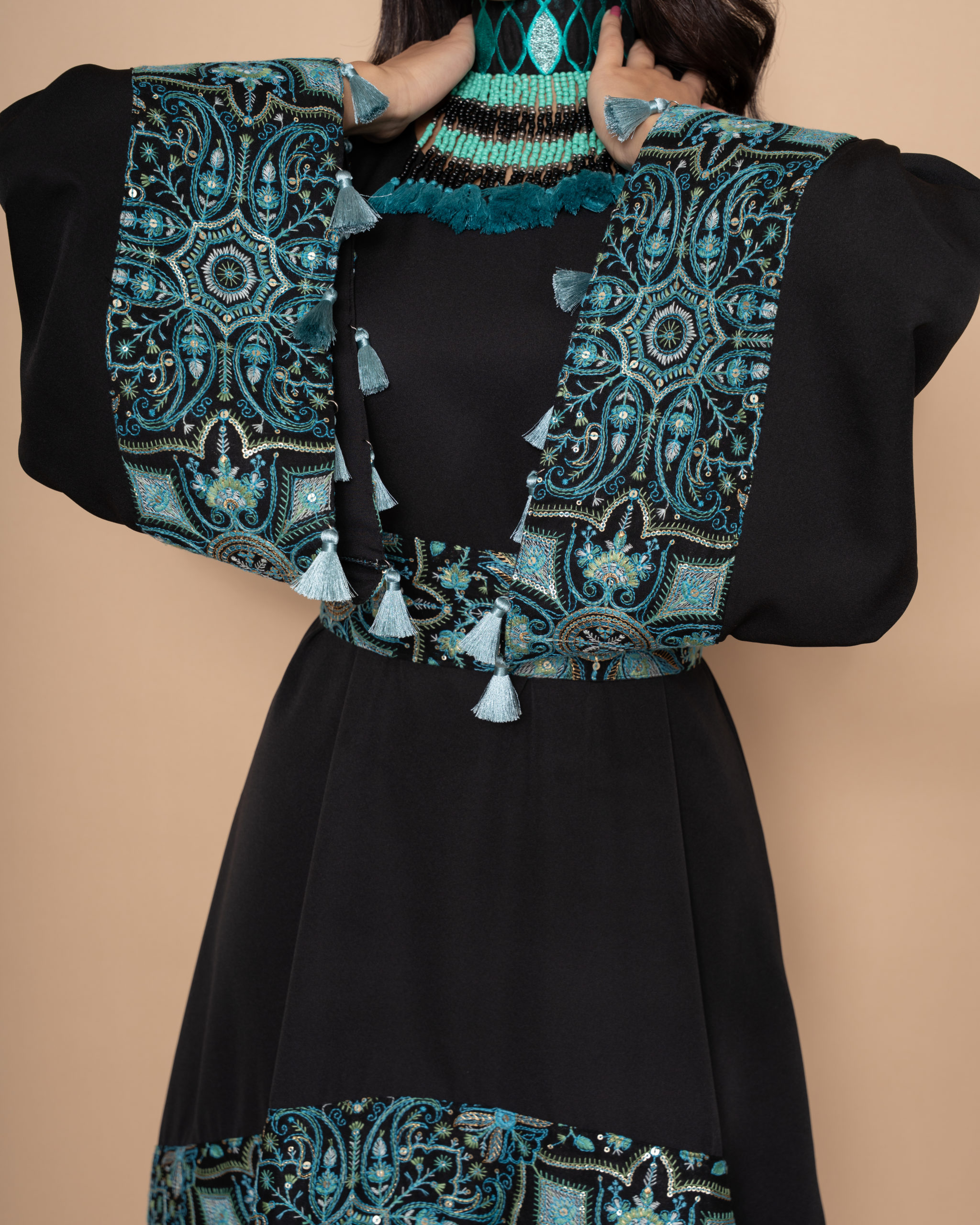 A black crepe maxi dress with bell-shaped sleeves and a belt. It features turquoise, gold and black geometric patterns embroidered on the modern sleeves, two bold horizontal panels, and the belt. The sleeves are elegantly finished with turquoise tassels.