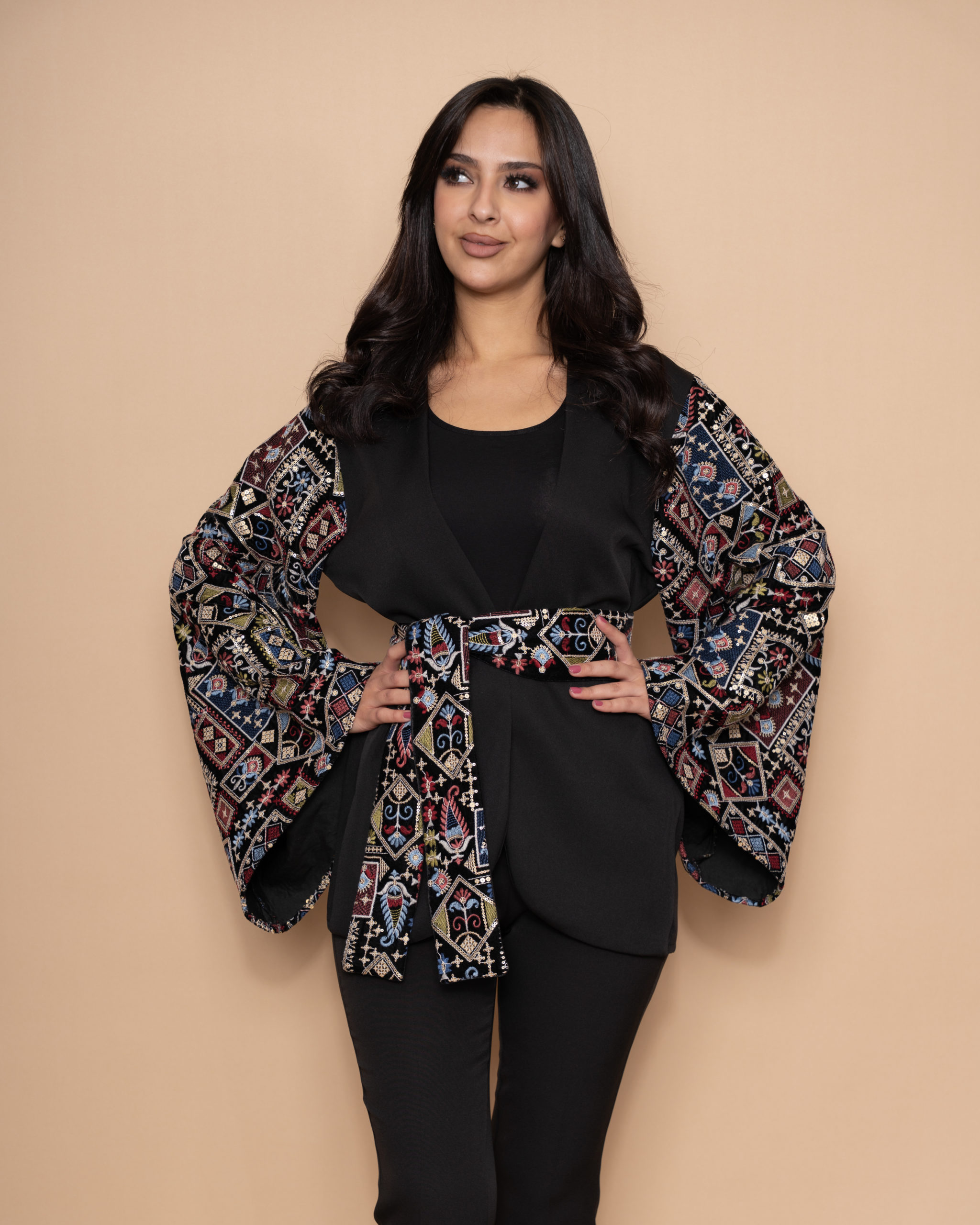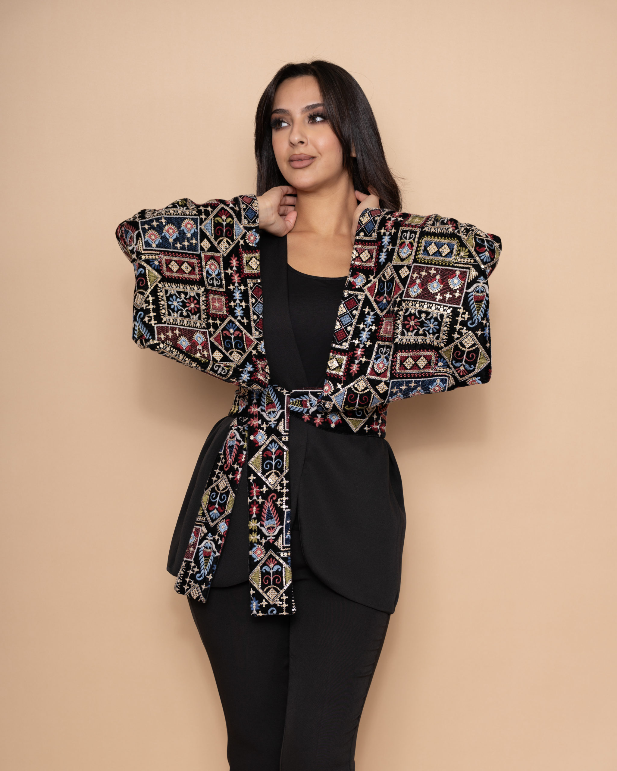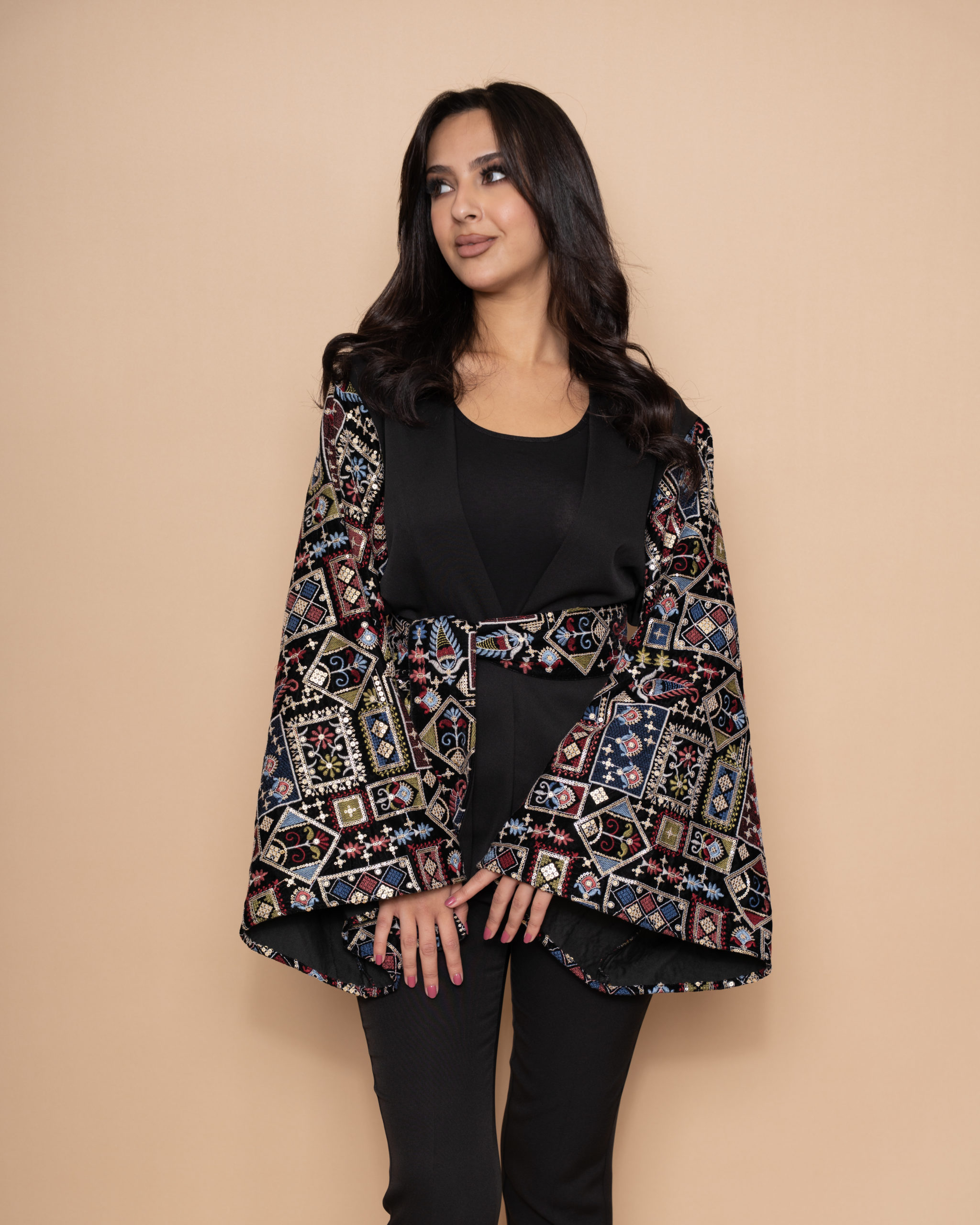 A black formal crepe jacket designed with bell-shaped sleeves. Geometric patterns in burgundy, navy blue, and gold on elegant velvet background made it more special, forming a wonderful Fallahi embroidery on the full sleeves and the belt.