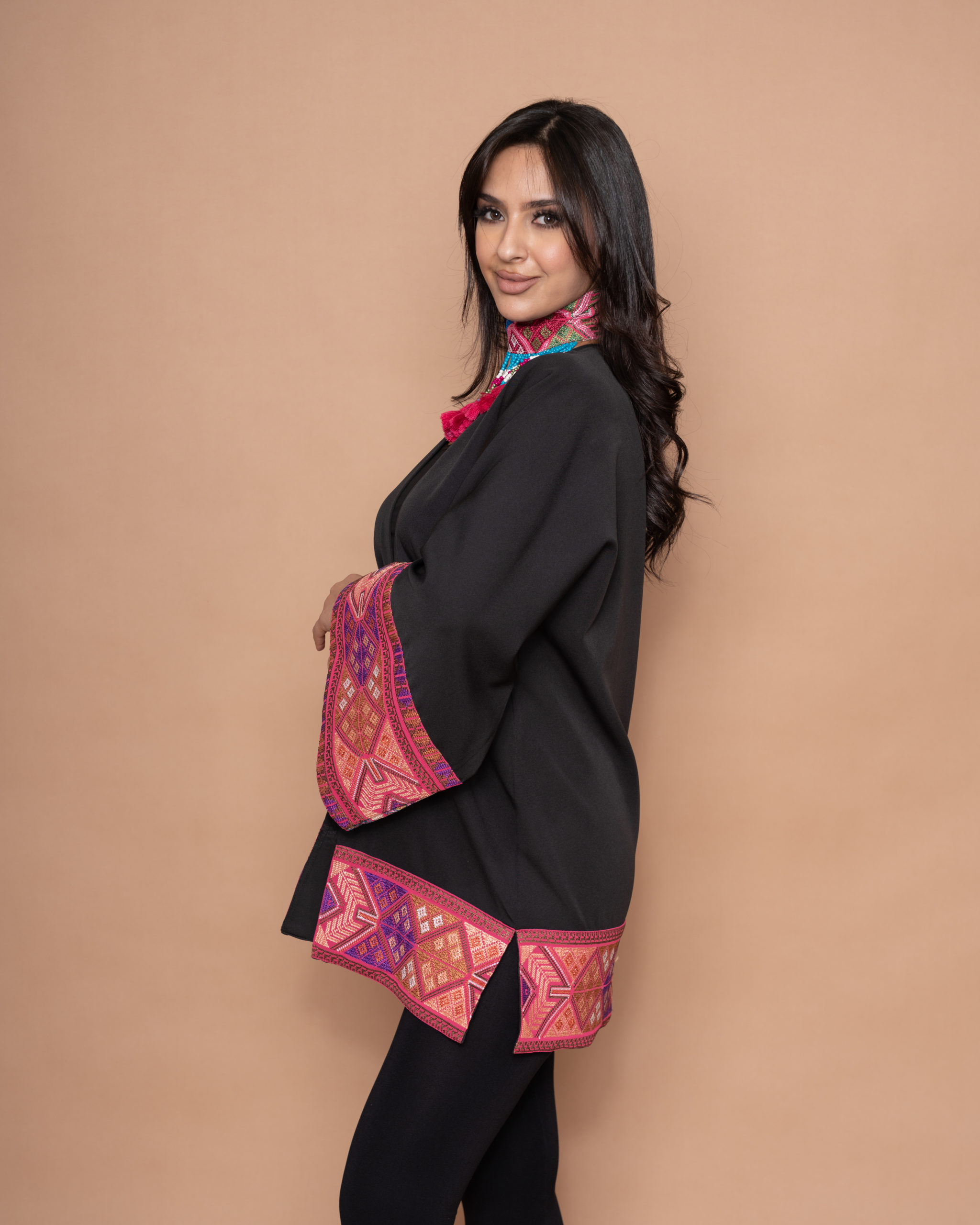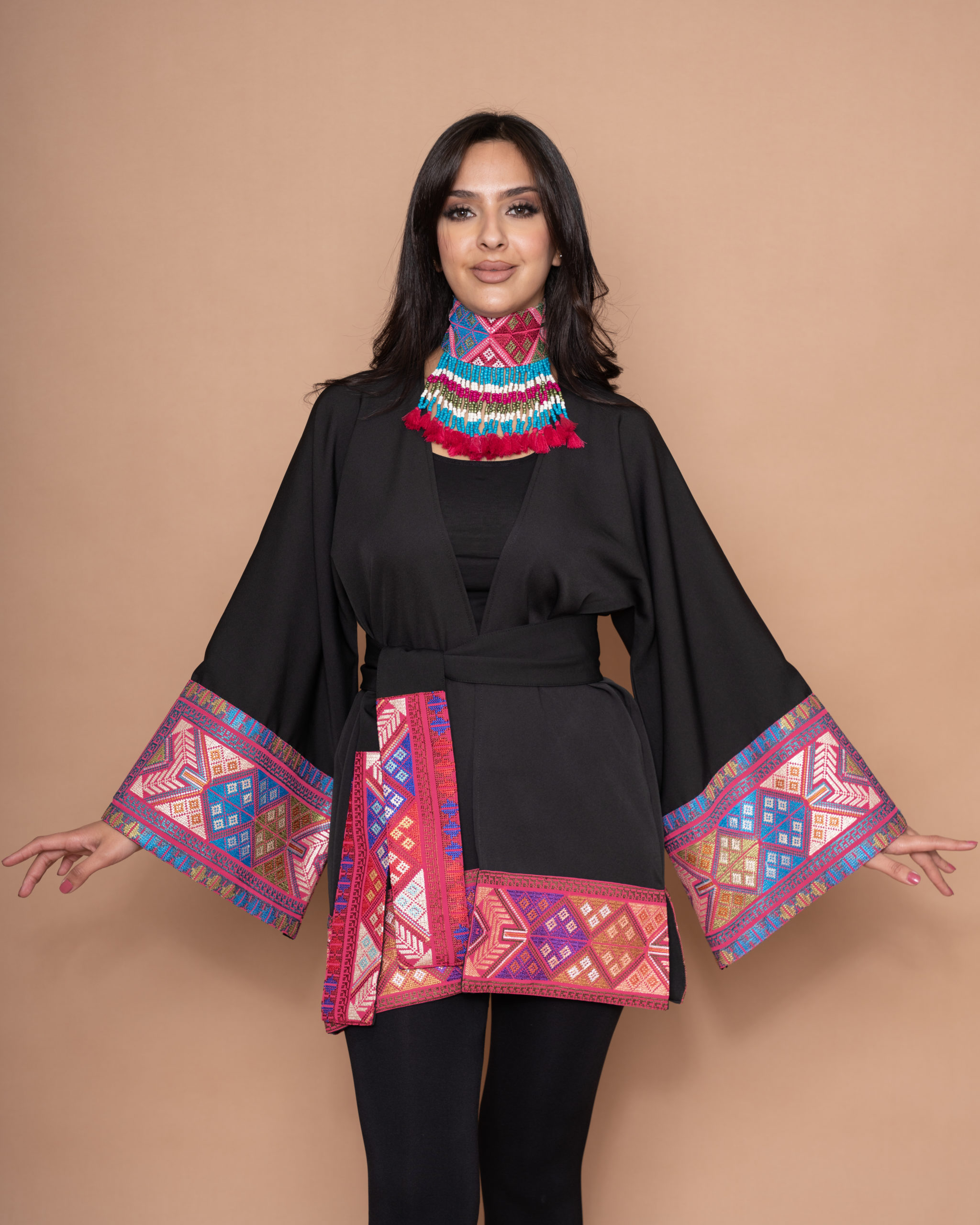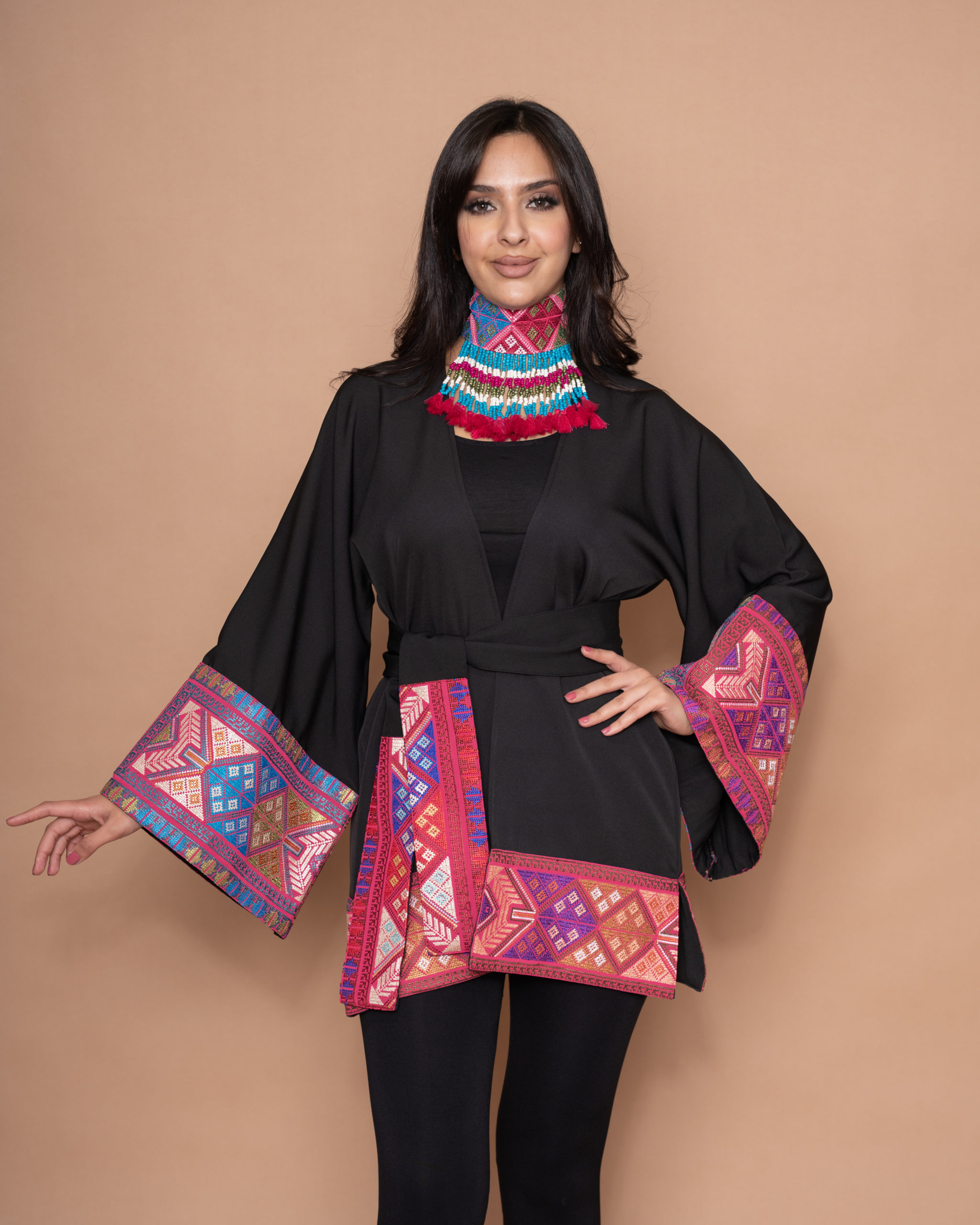A black crepe open-side jacket with a belt and bell-shaped sleeves. It is embroidered with fuchsia, blue, and orange geometric patterns forming a wonderful Fallahi embroidery design. This piece is an amazing mix of traditional patterns and modern colors.