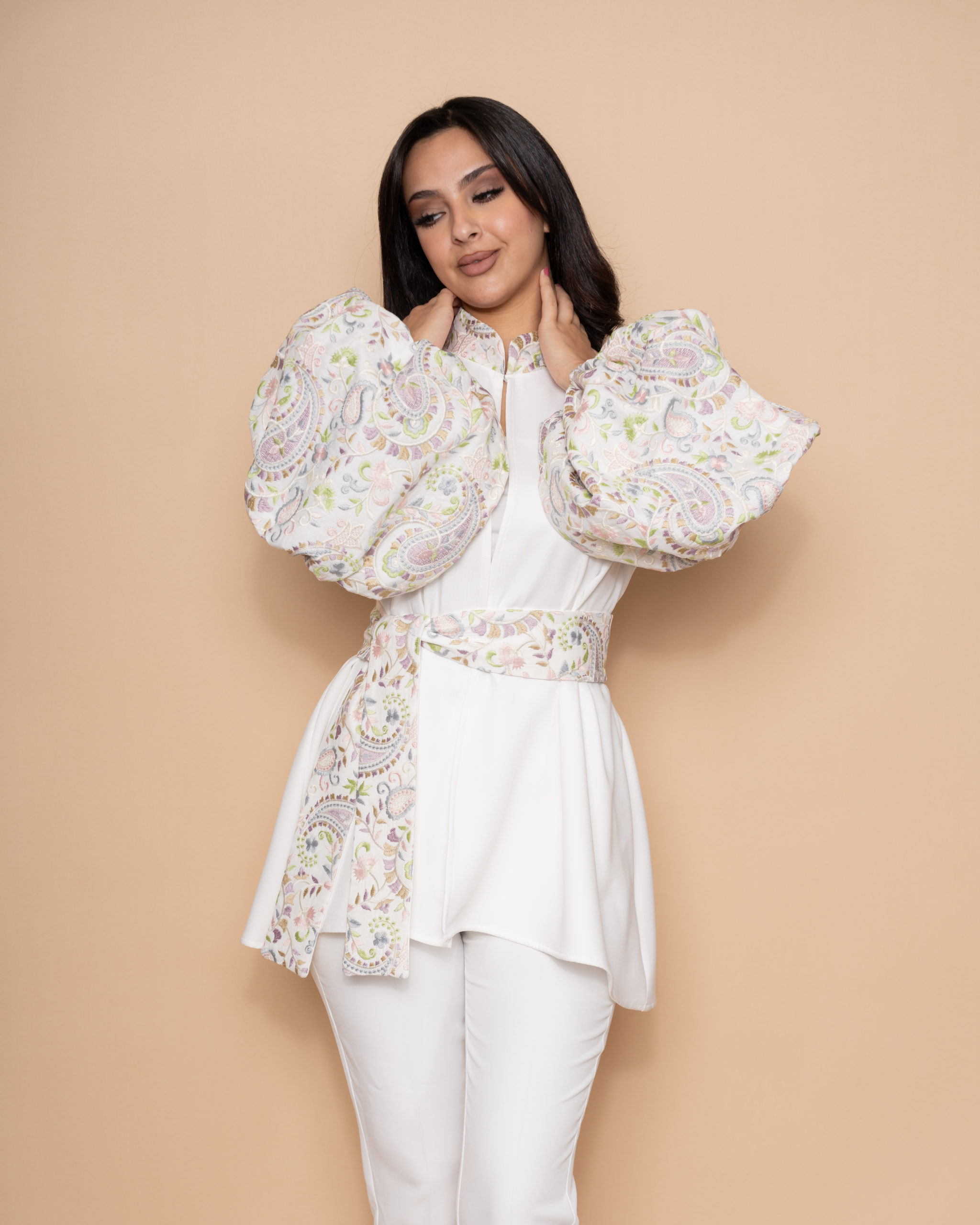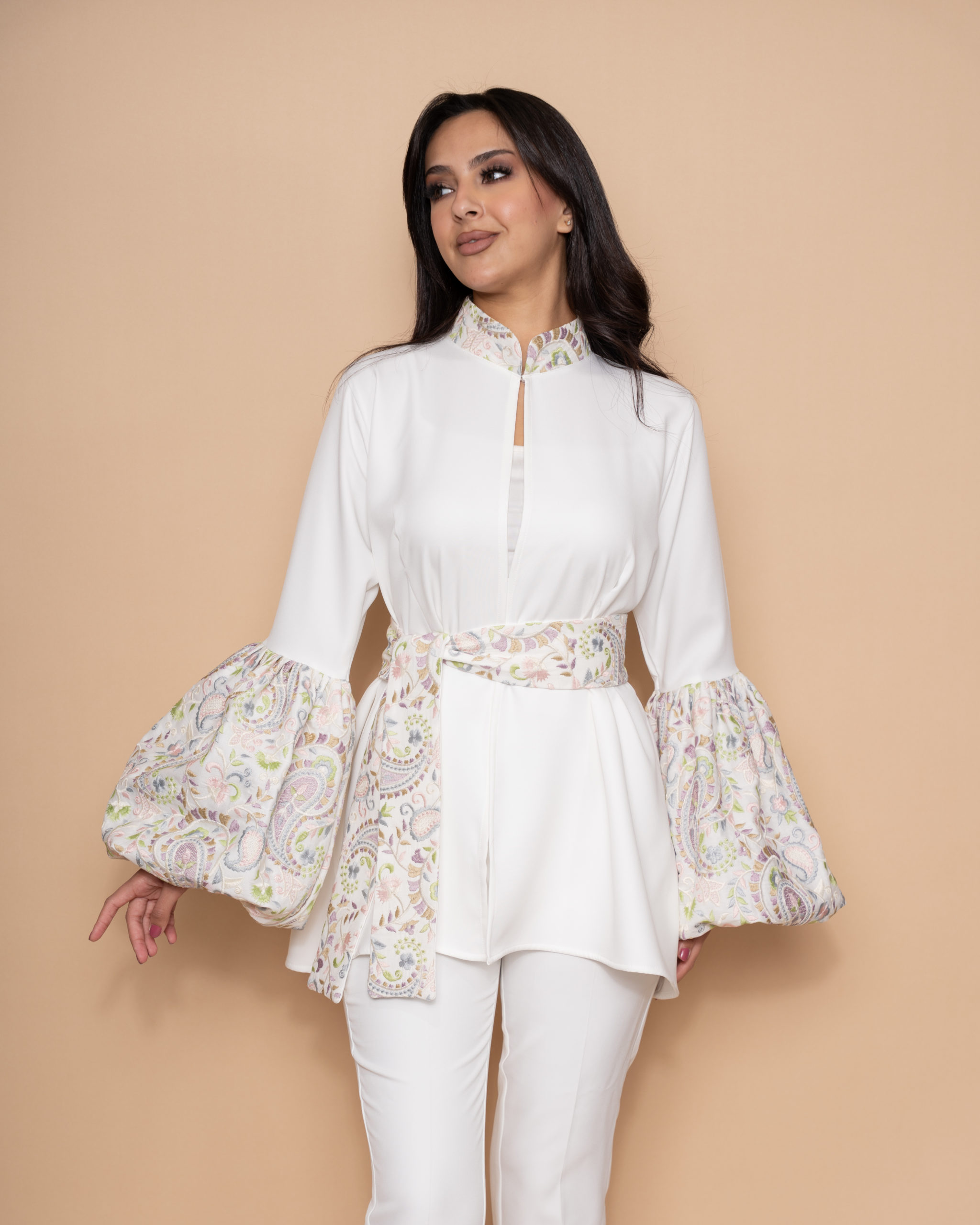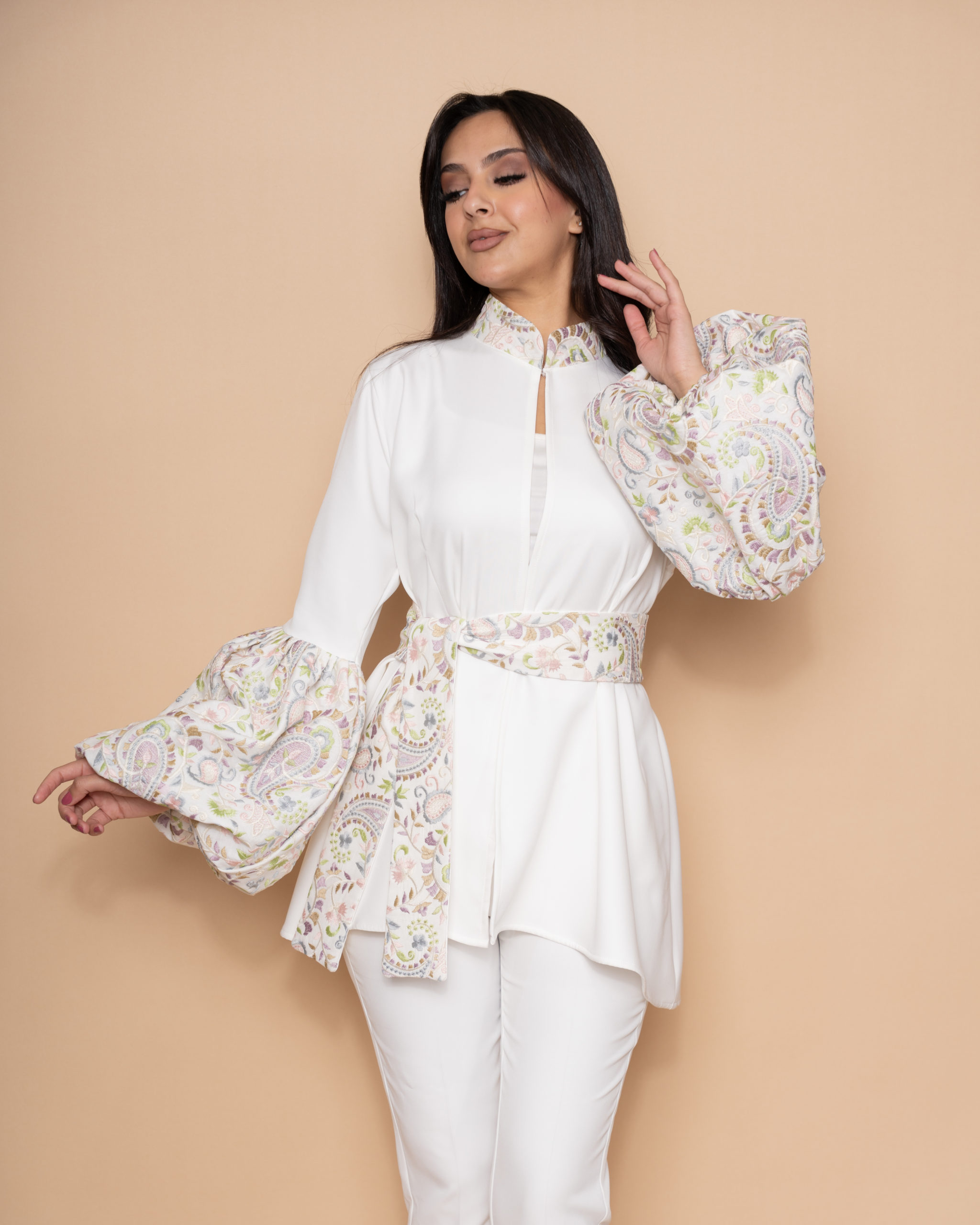 A beautiful white crepe jacket with belt, amazing puffed sleeves, and a semi-high neck. It is designed with elegant floral and Buta patterns in a soft palette of a pastel multi-colored embroidery. The semi-high embroidered neck gives it a unique and elegant look.