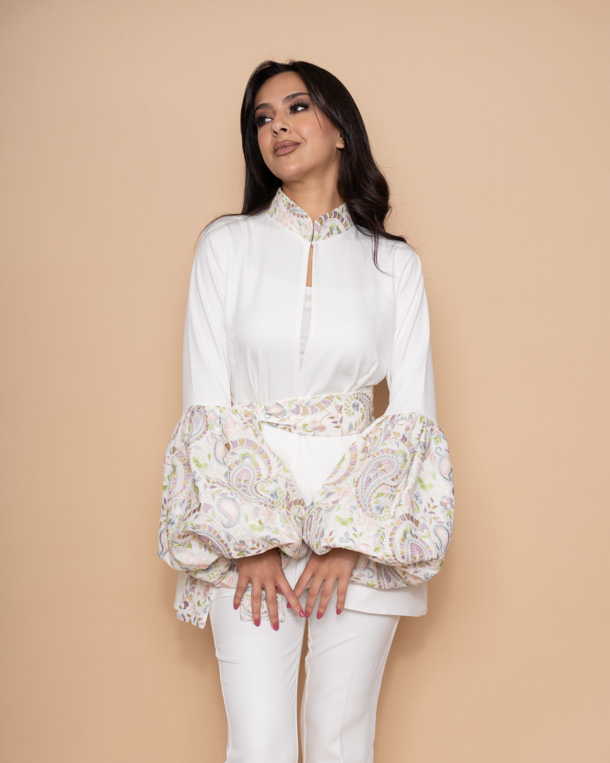 It can be styled with formal white pants or maxi skirt with the same fabric.