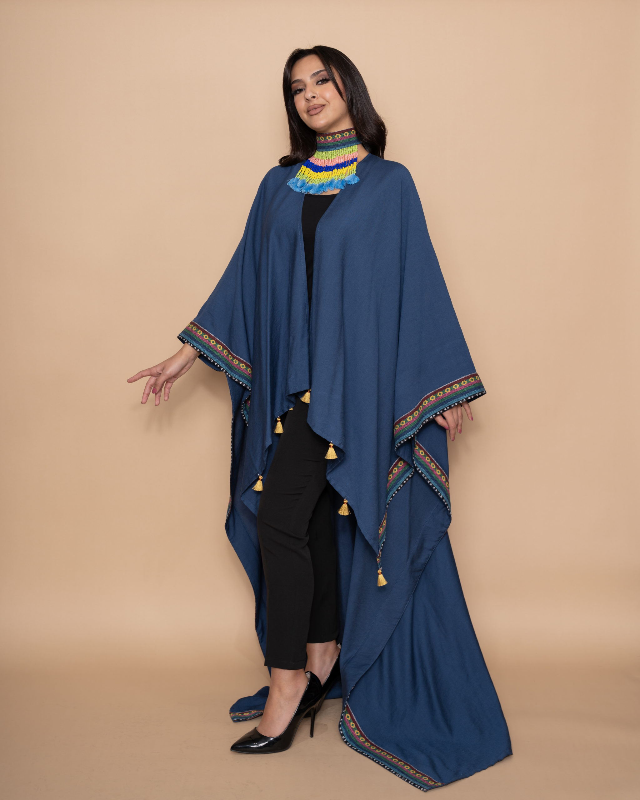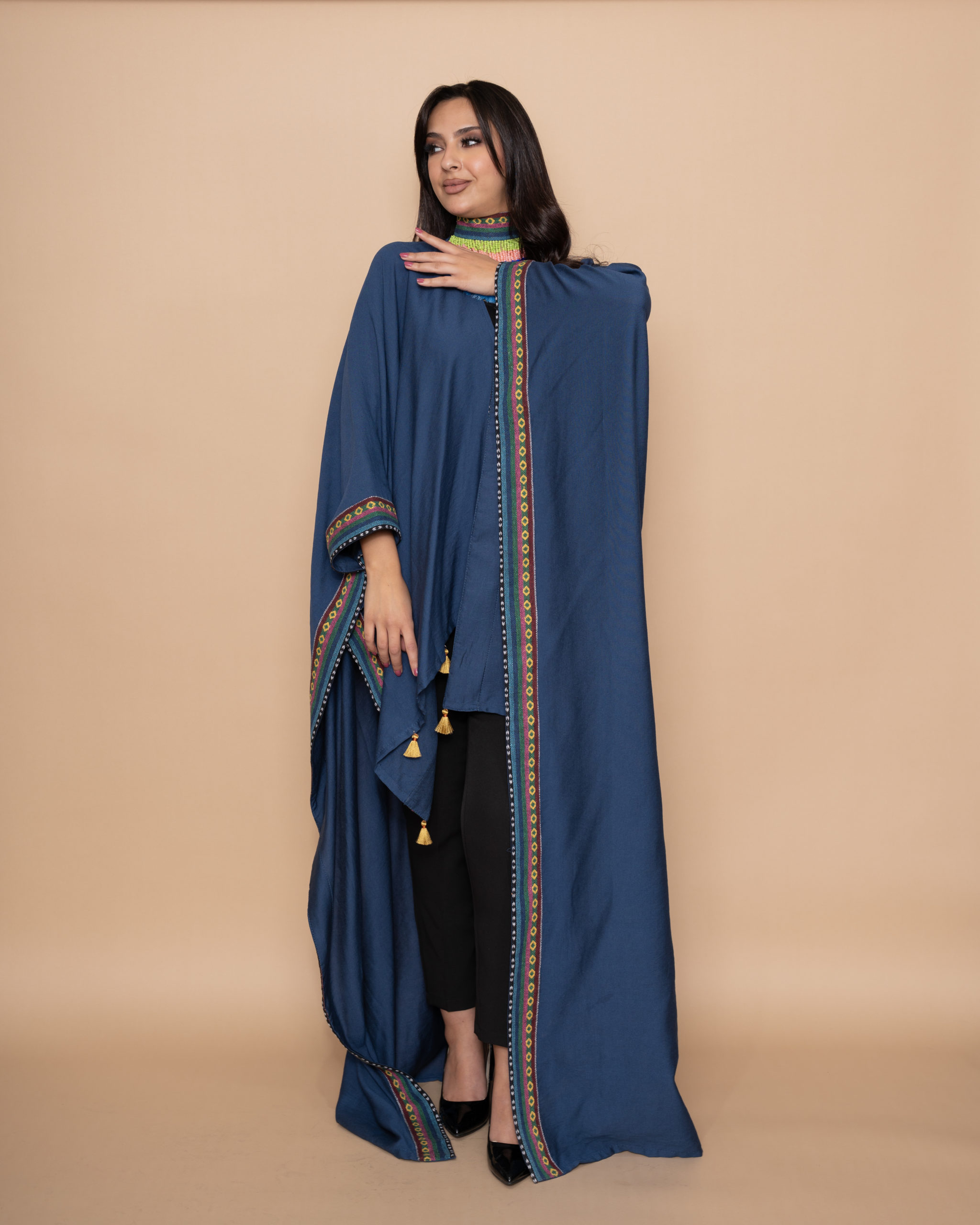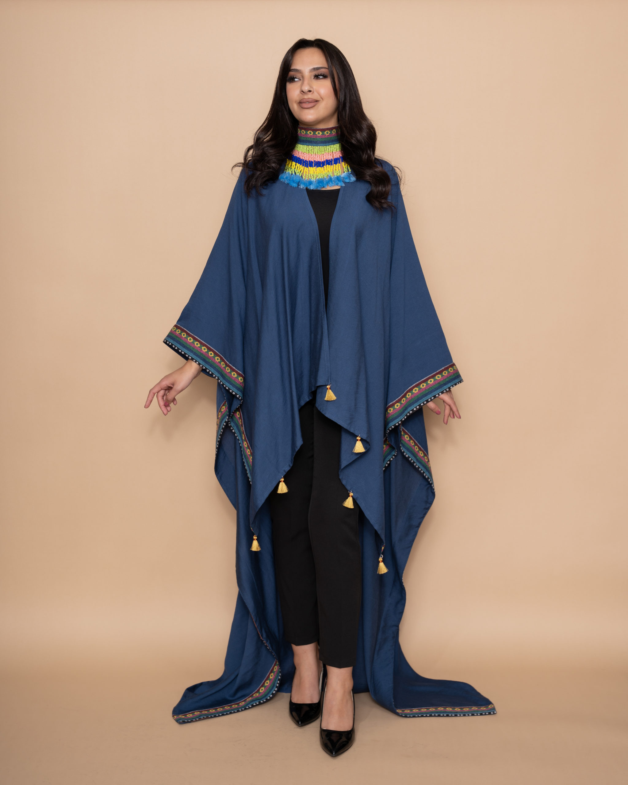 A unique blue linen shawl, shorter from the front and longer from the back, featuring yellow diamond-patterned with multi-colored woven lines along both side borders. This piece is a beautiful mix between traditional patterns and modern style.