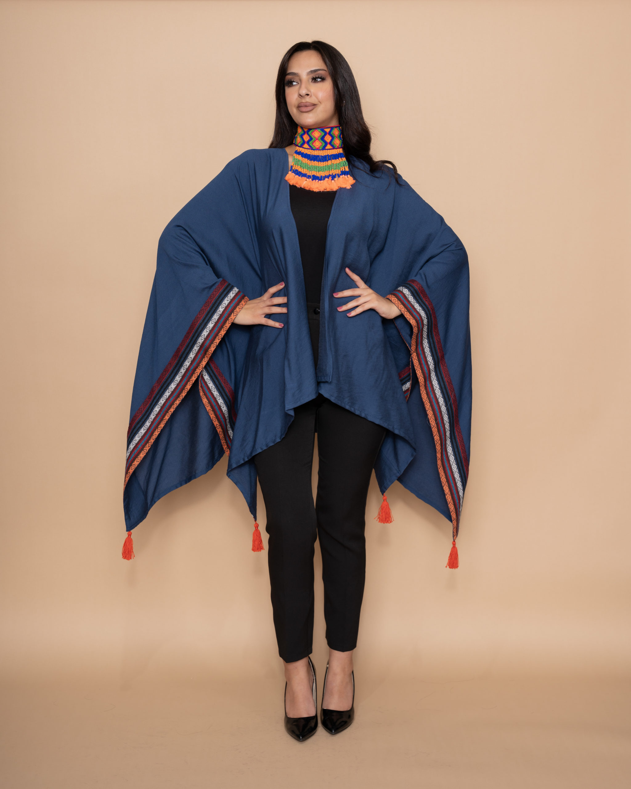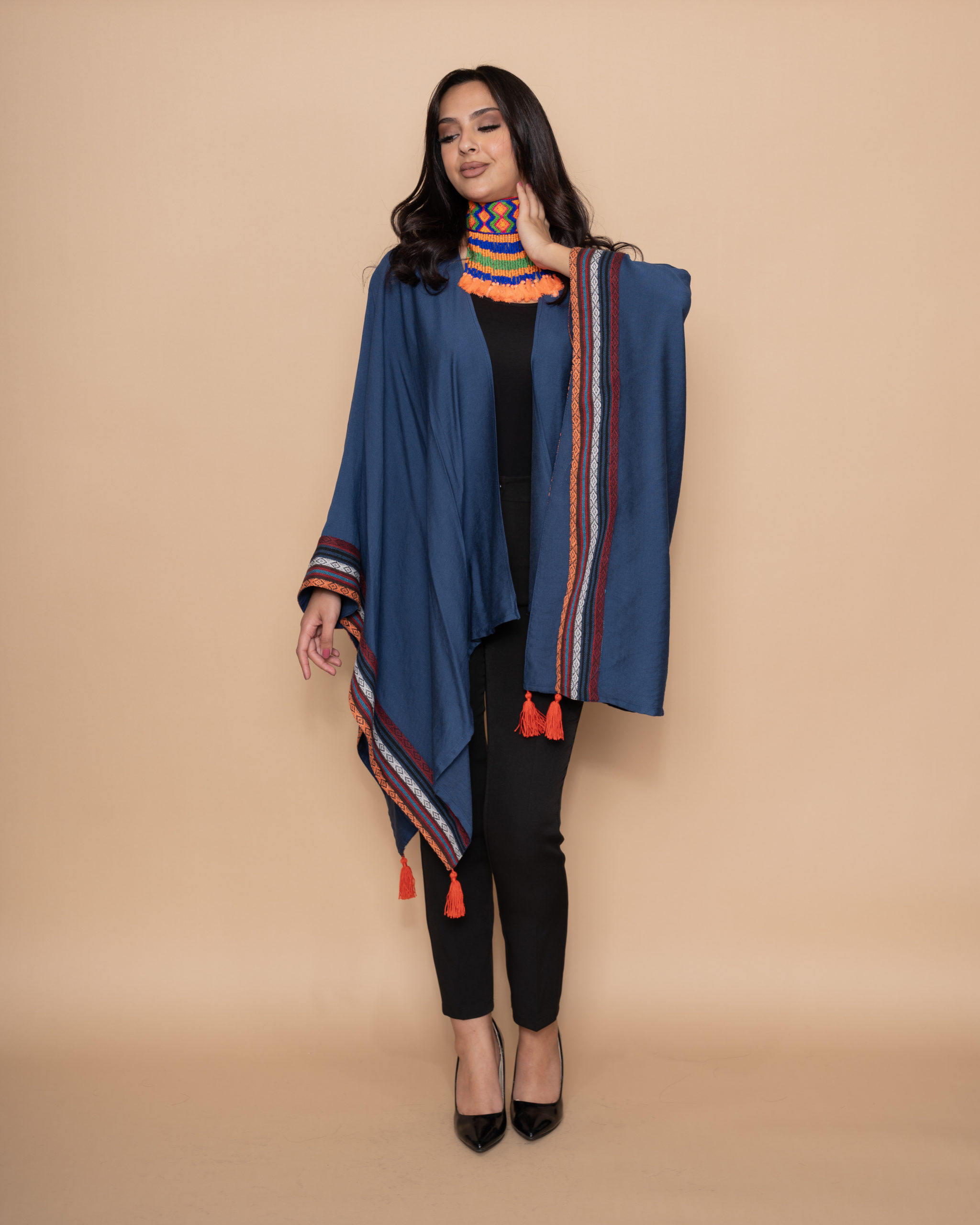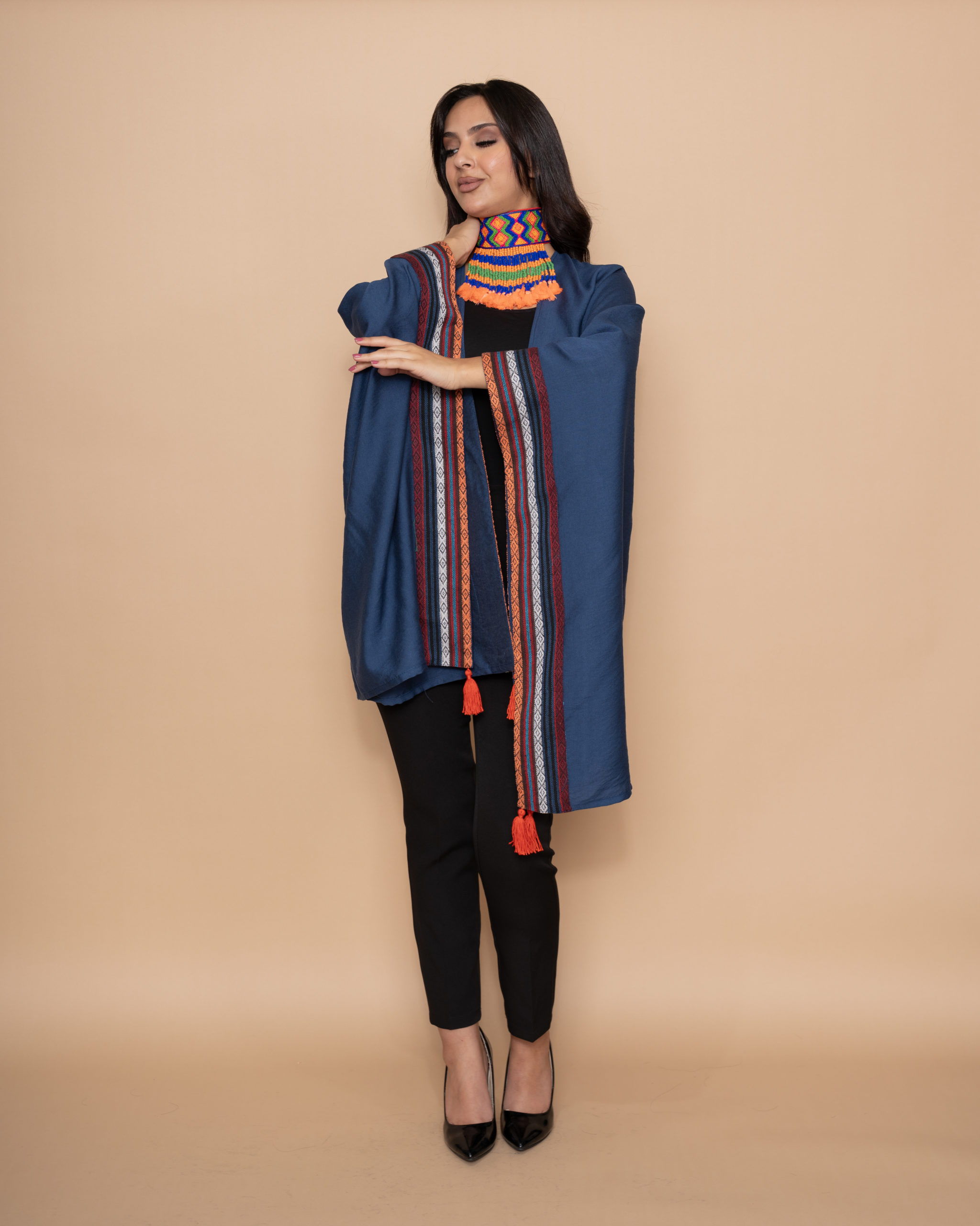 A dark blue linen short shawl. Featuring with red, orange, white, and black traditional vertical lines, decorated with hand made modern orange tassel endings. This piece is a mix between traditional patterns and modern motif colors.