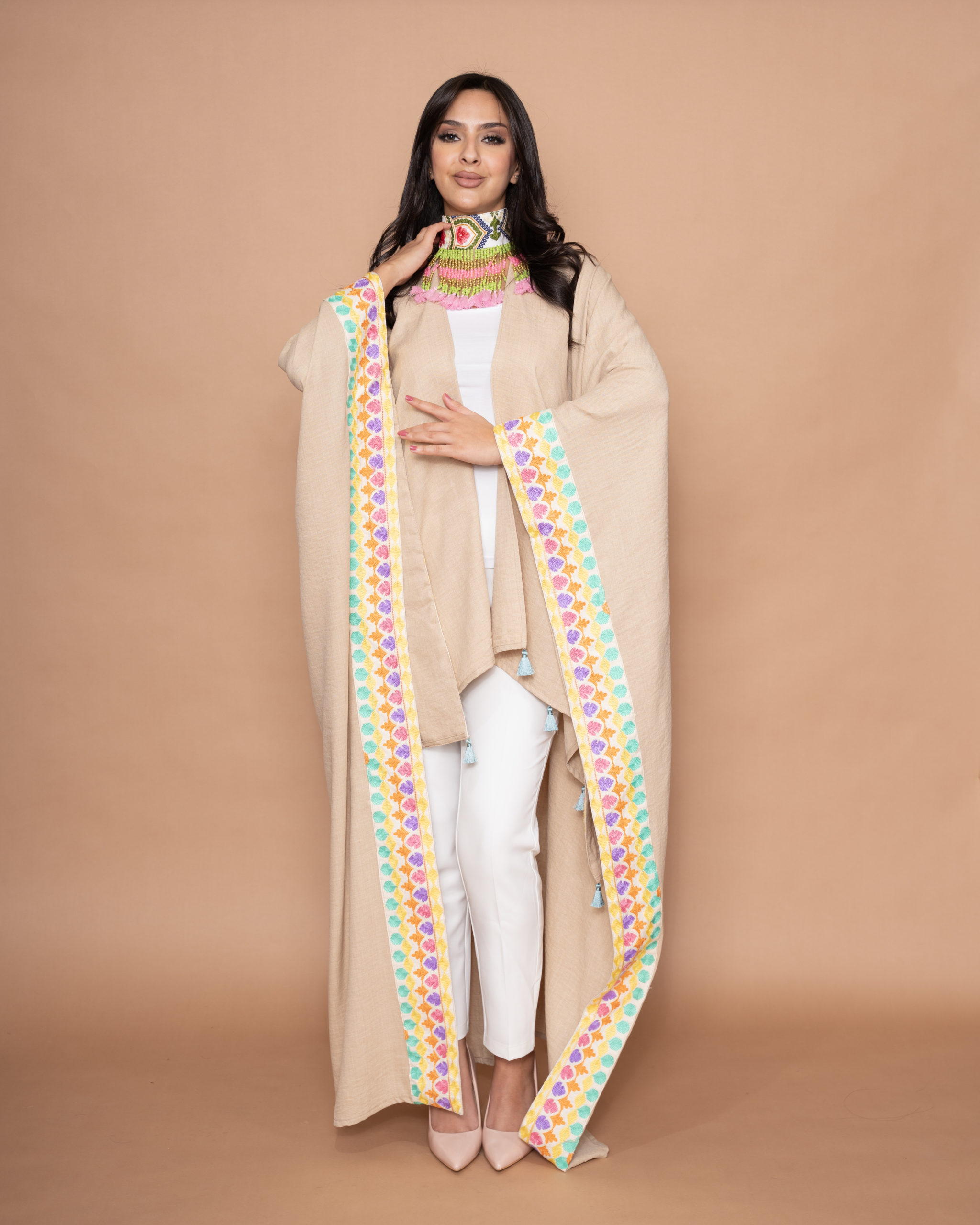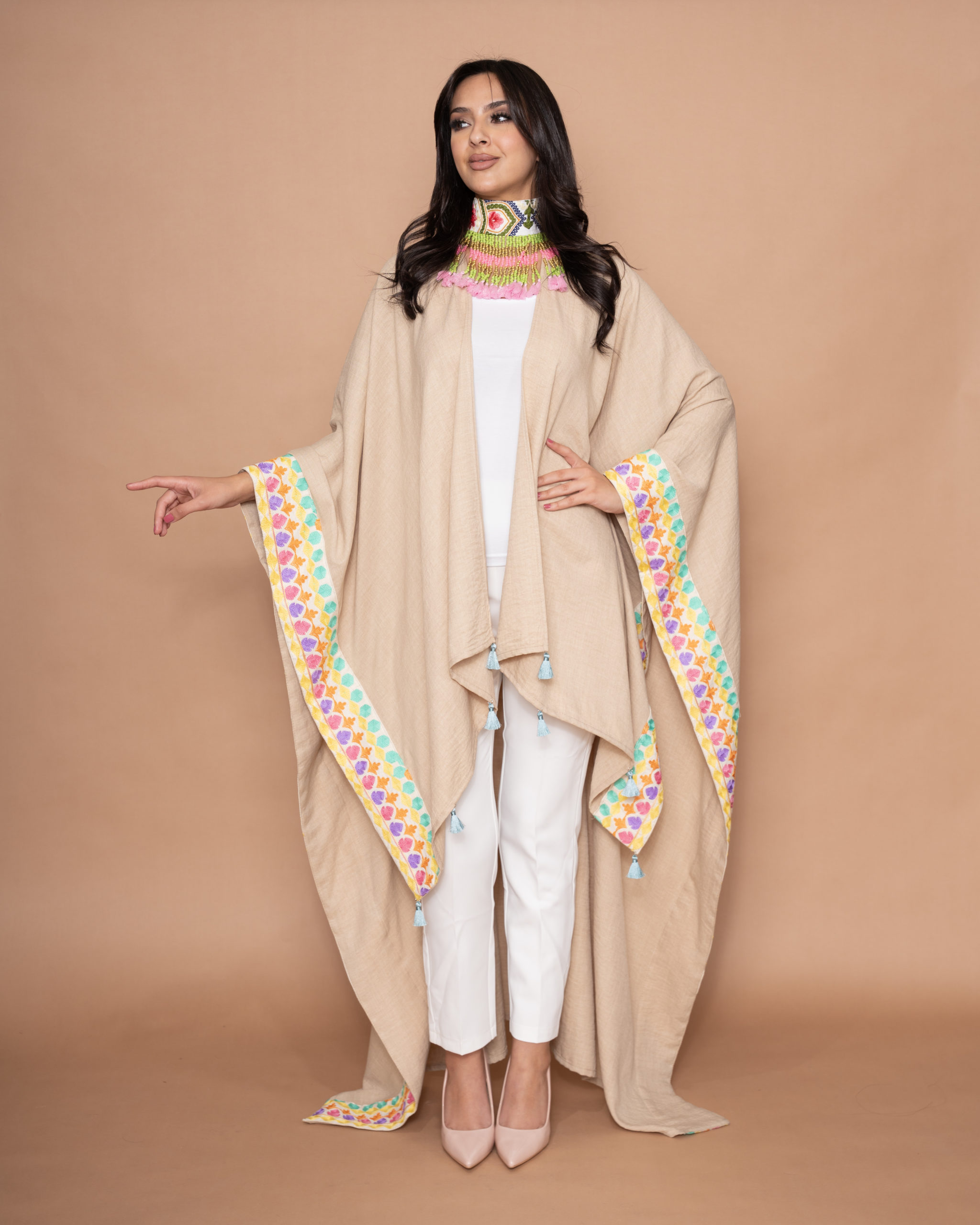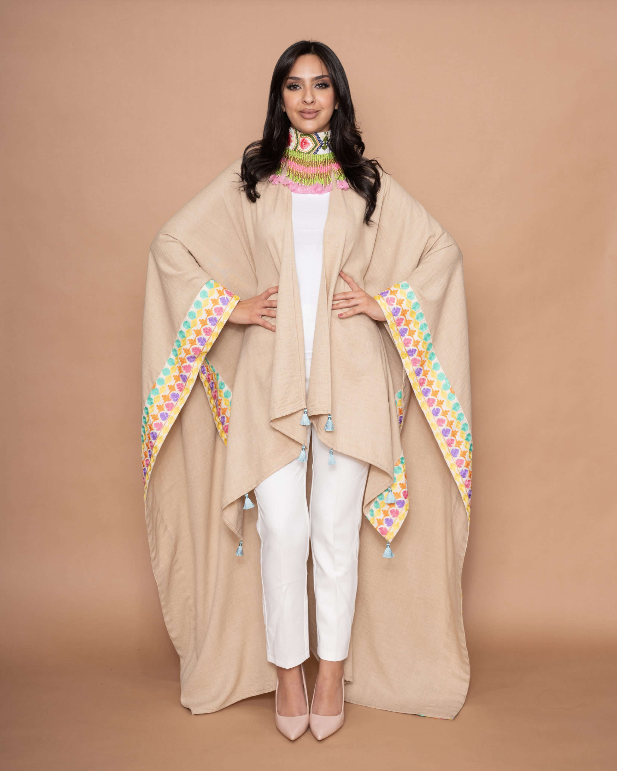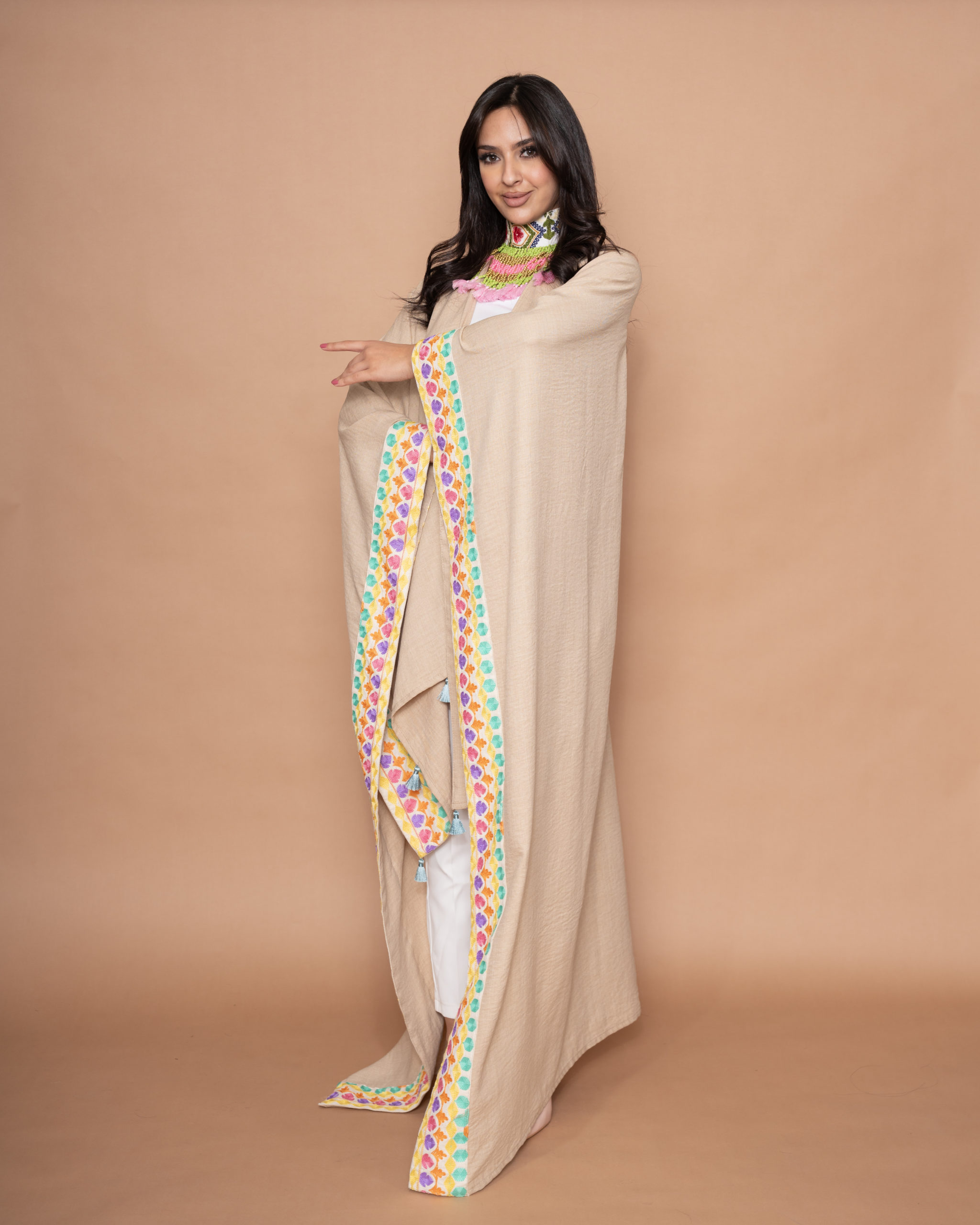 A stylish light beige linen shawl, shorter at the front and longer at the back, with a pastel palette of orange, blue, pink and purple small geometric shapes embroidery along both side borders. This beautiful piece is finished with light blue tassels.