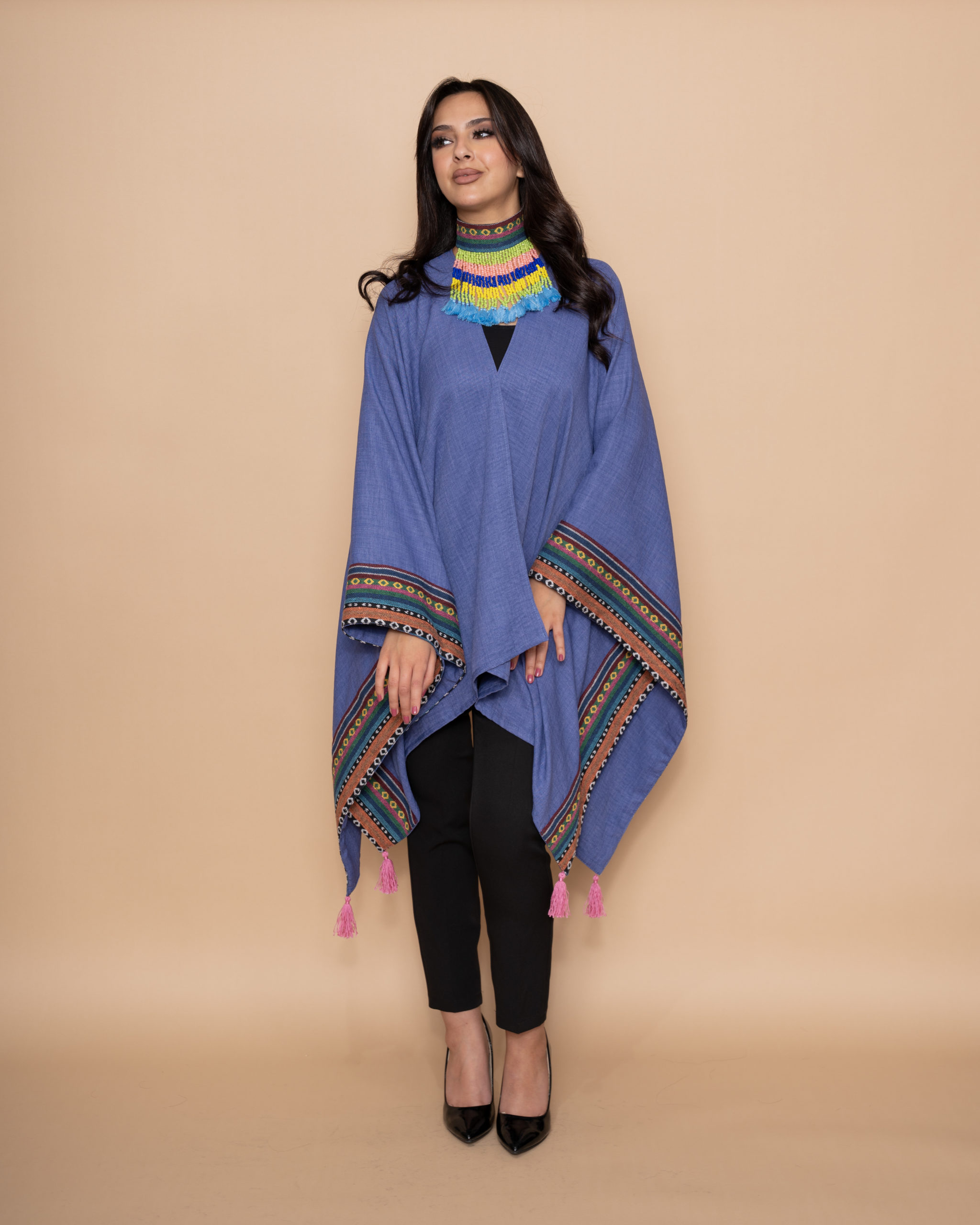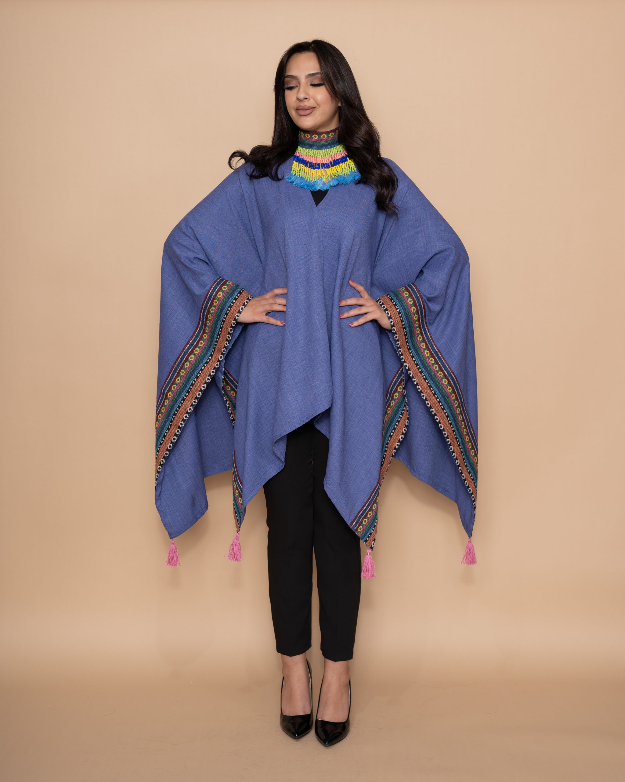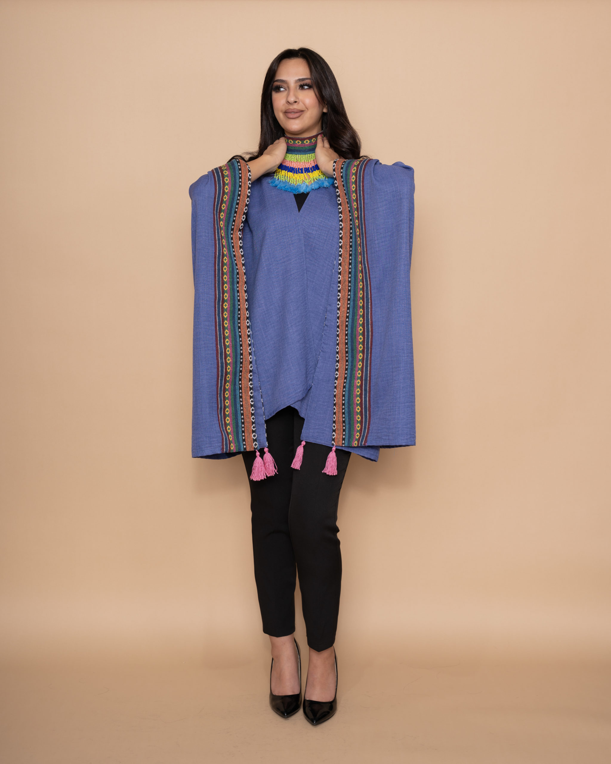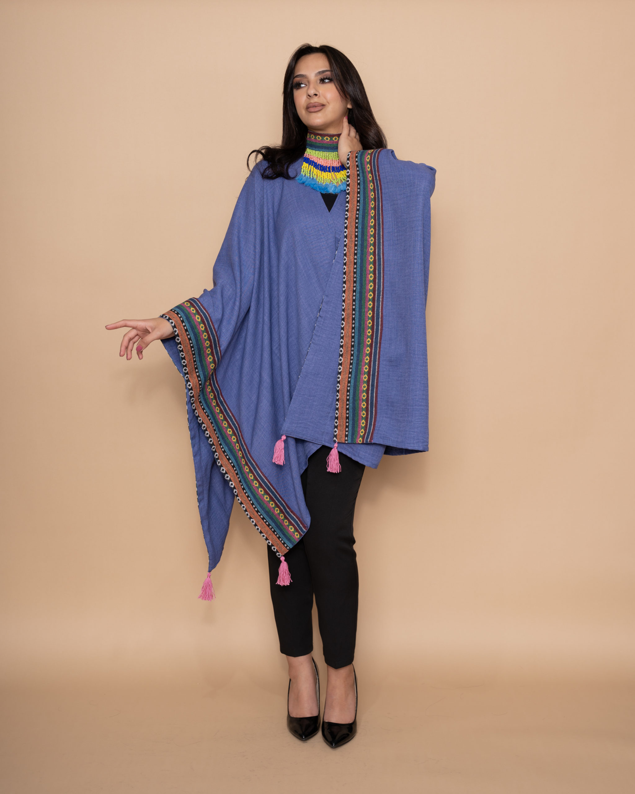 A Stylish light purple linen short shawl, featuring with diamond patterns on blue, orange, burgundy, woven lines, along both side borders with handmade modern pink tassel endings.