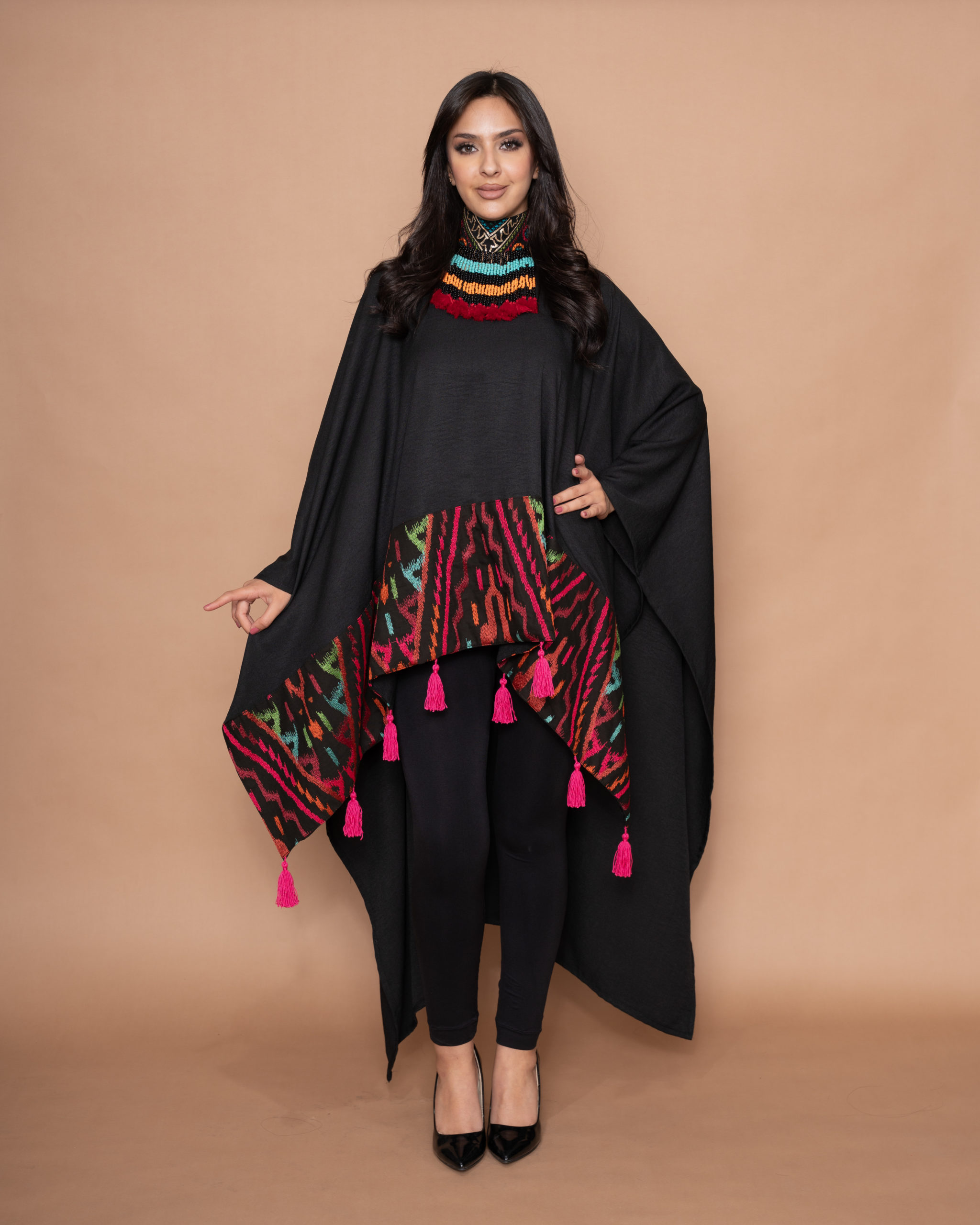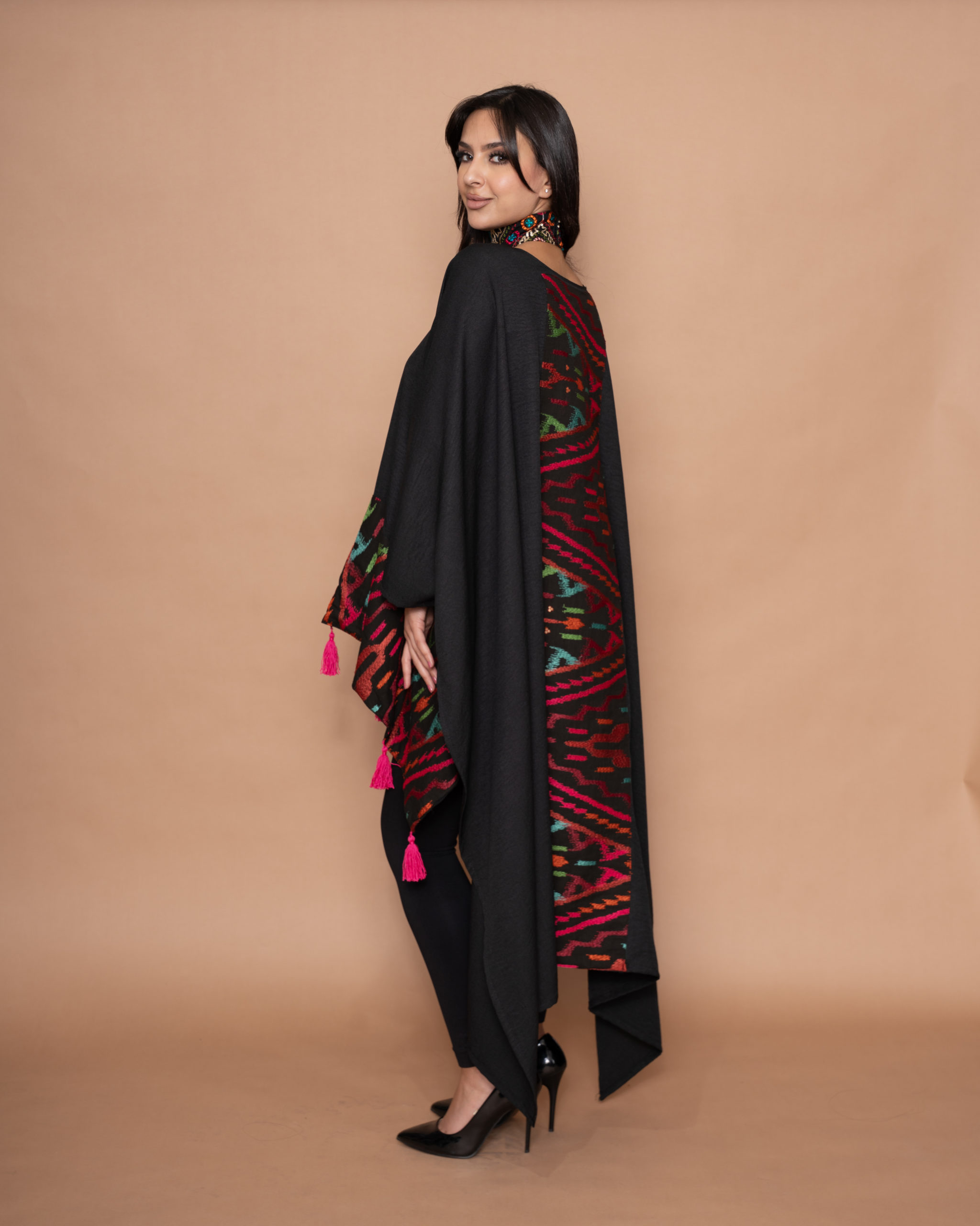 A modern black linen wide top, shorter at the front and longer at the back. Designed with green, orange and red geometric patterns embroidered on front horizontal panel and along the back vertical panel. This piece is elegantly finished with modern pink tassels.