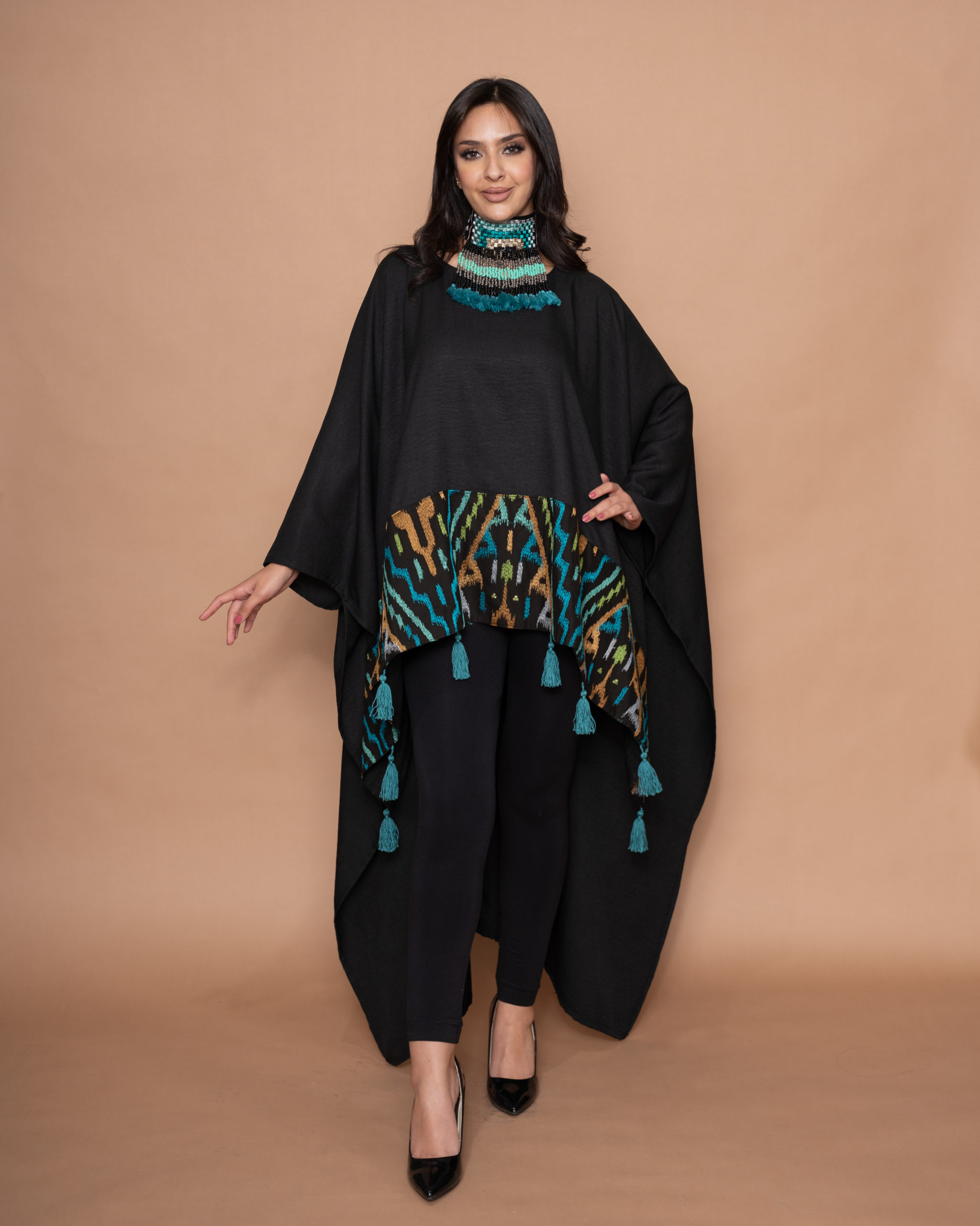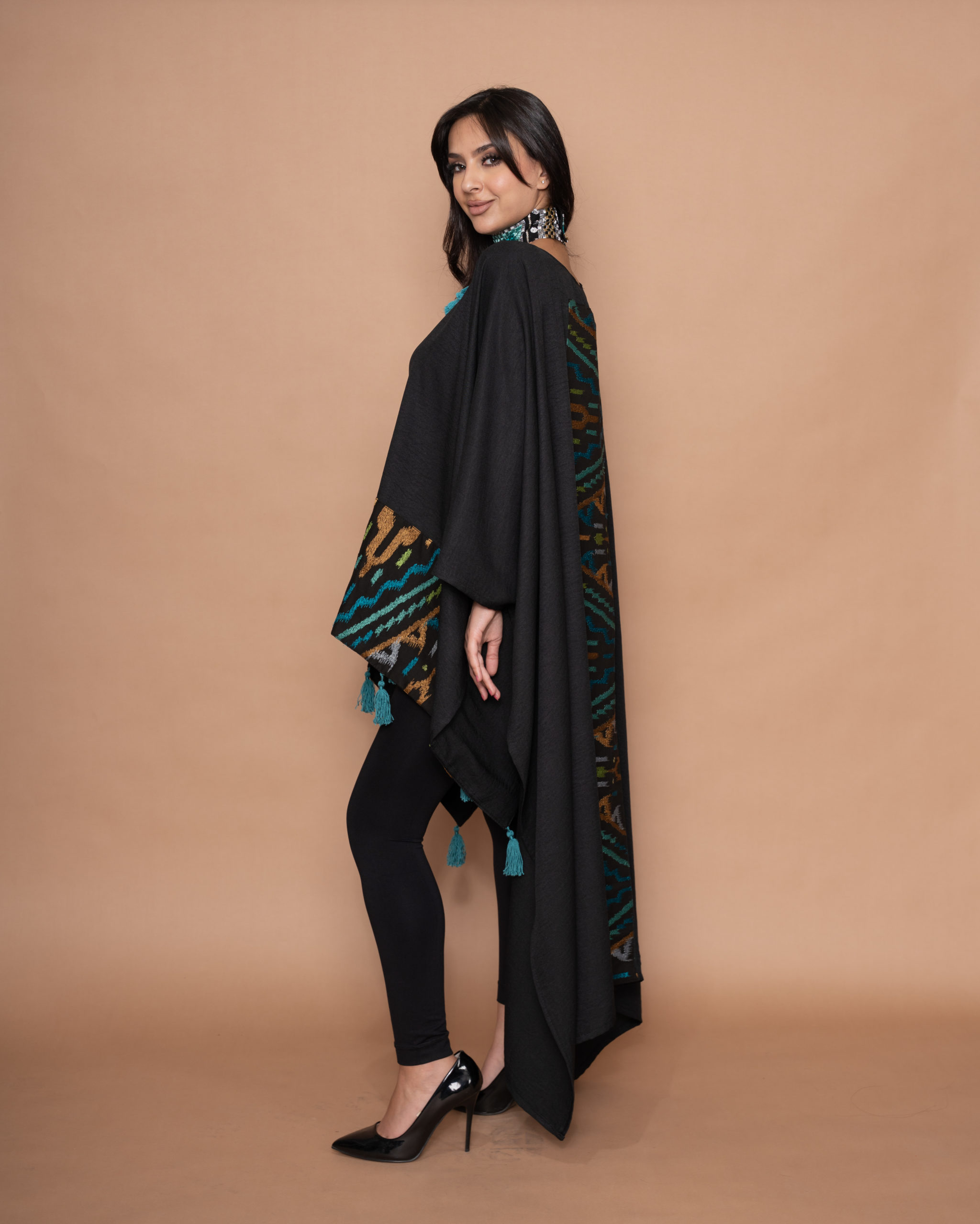 A modern black linen wide top, shorter at the front and longer at the back. Designed with a front horizontal line and a back vertical line of brown, blue, gray, and turquoise geometric embroidery, finished with turquoise handmade tassels.