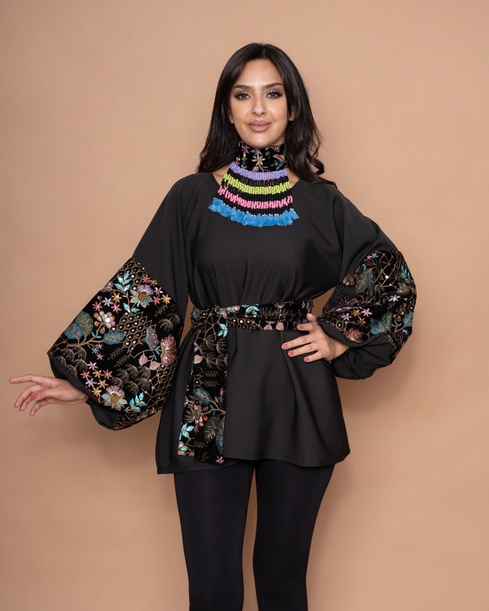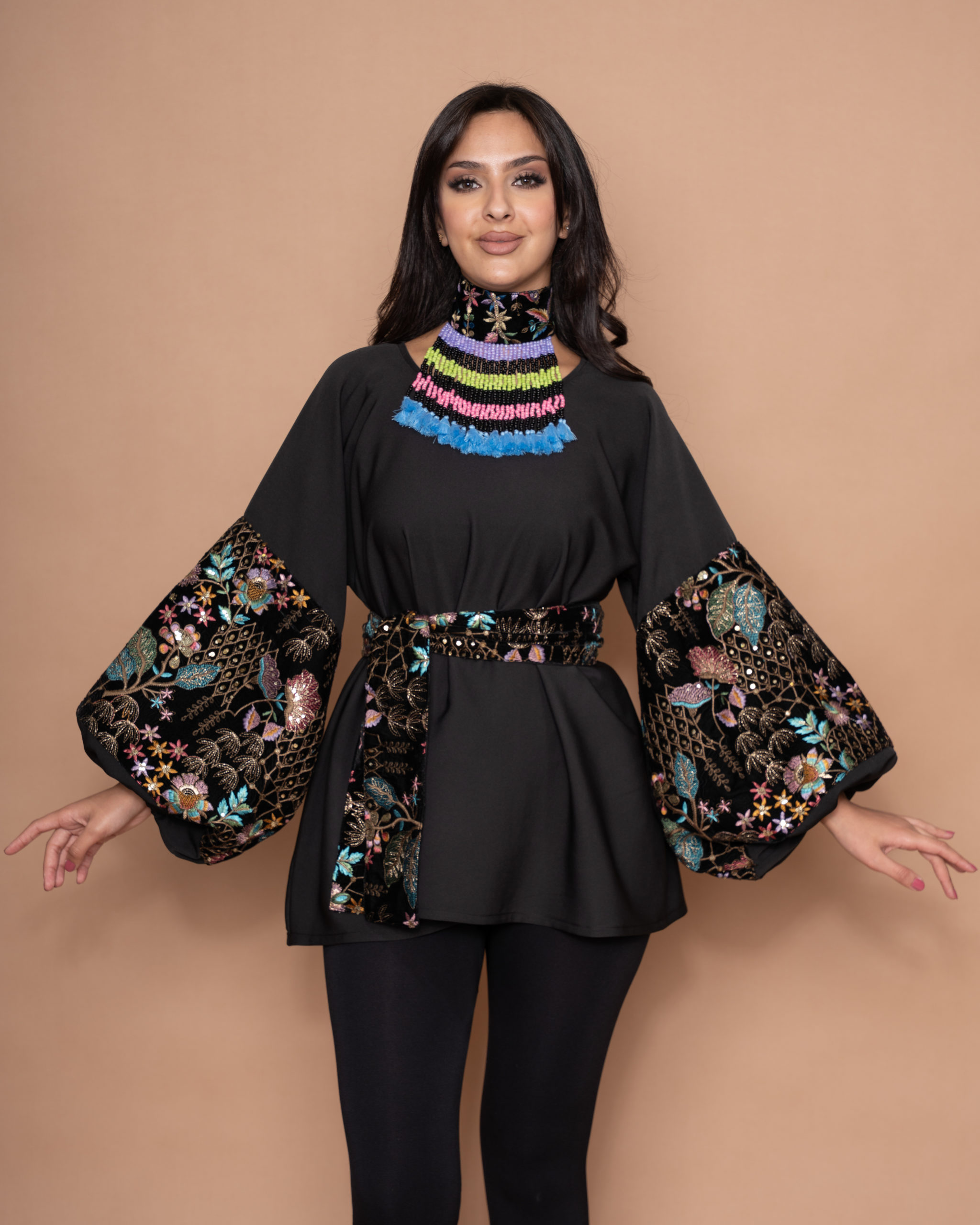 An elegant black crepe puffed sleeves top with fully embroidered belt . Designed with blue, purple, pink, and gold rich floral embroidery on a luxurious velvet background covering the modern puffed sleeves and the belt.