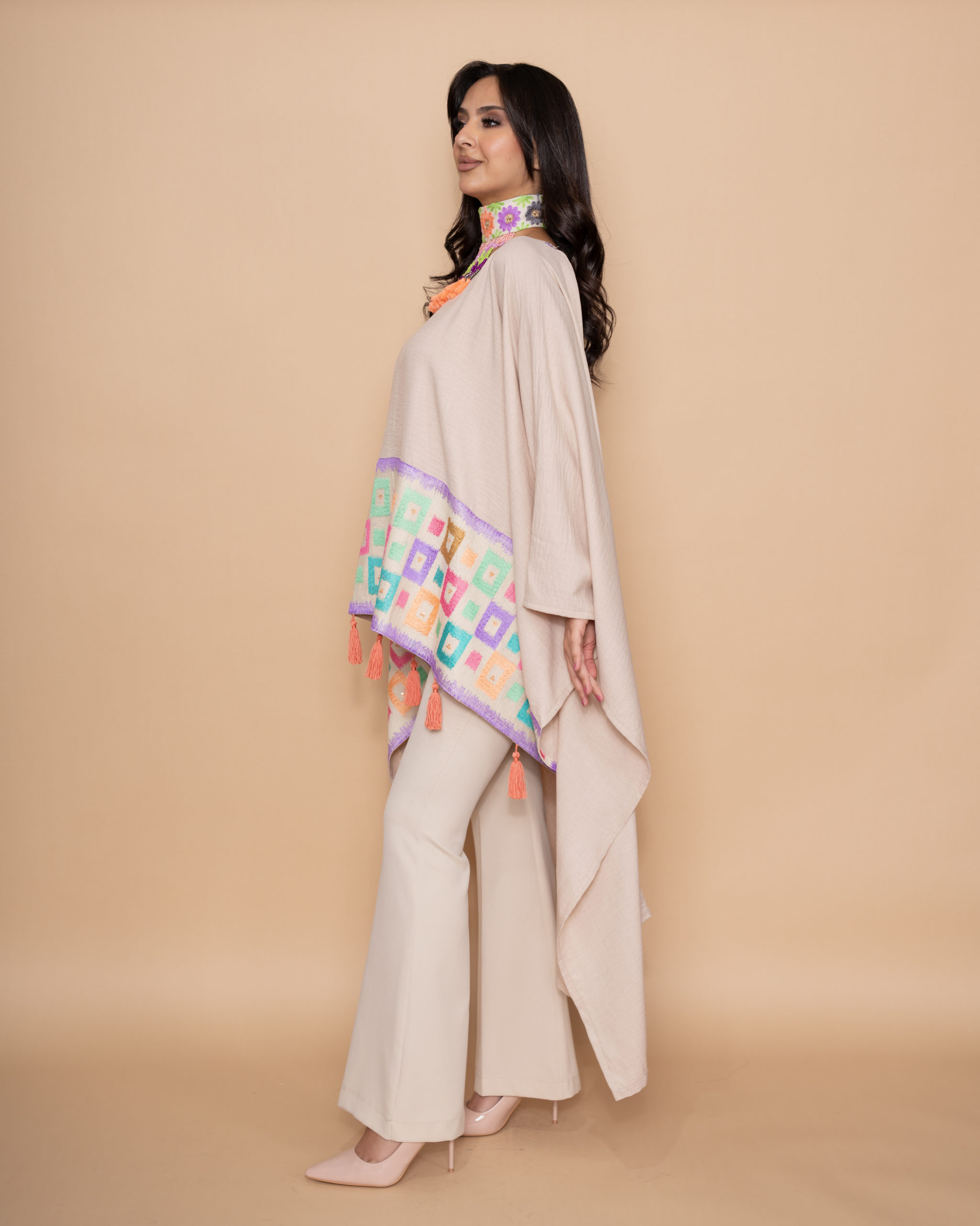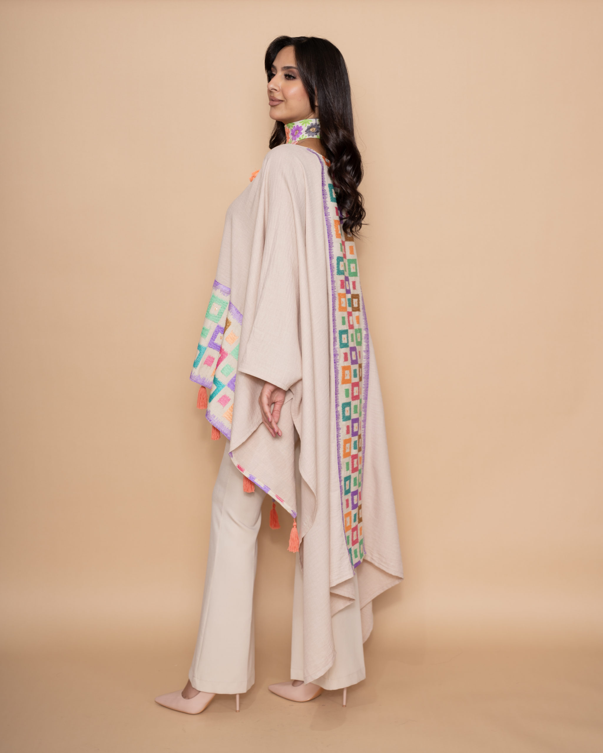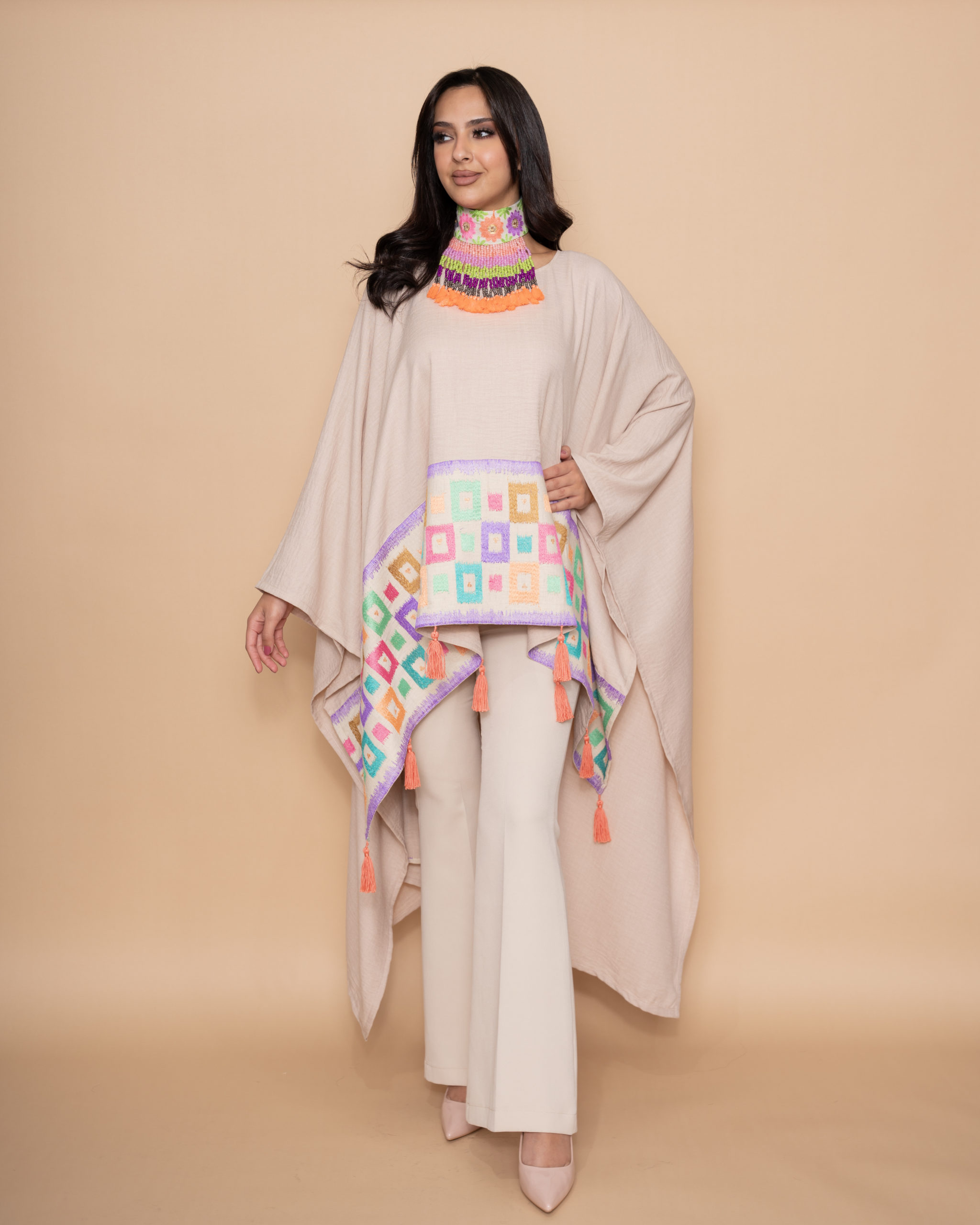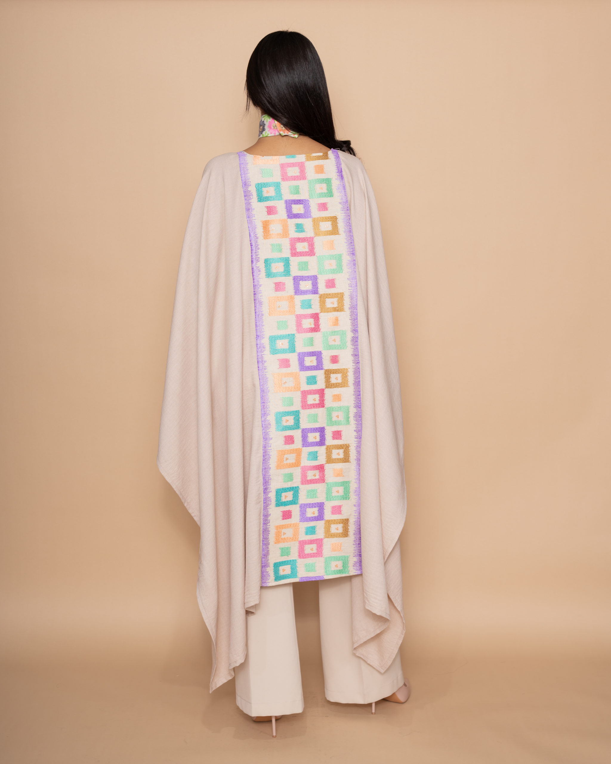 A modern beige linen wide top, shorter at the front and longer at the back. Designed with a front horizontal line and a back vertical line of pink, purple and blue small square embroidery, finished with peach handmade tassels.