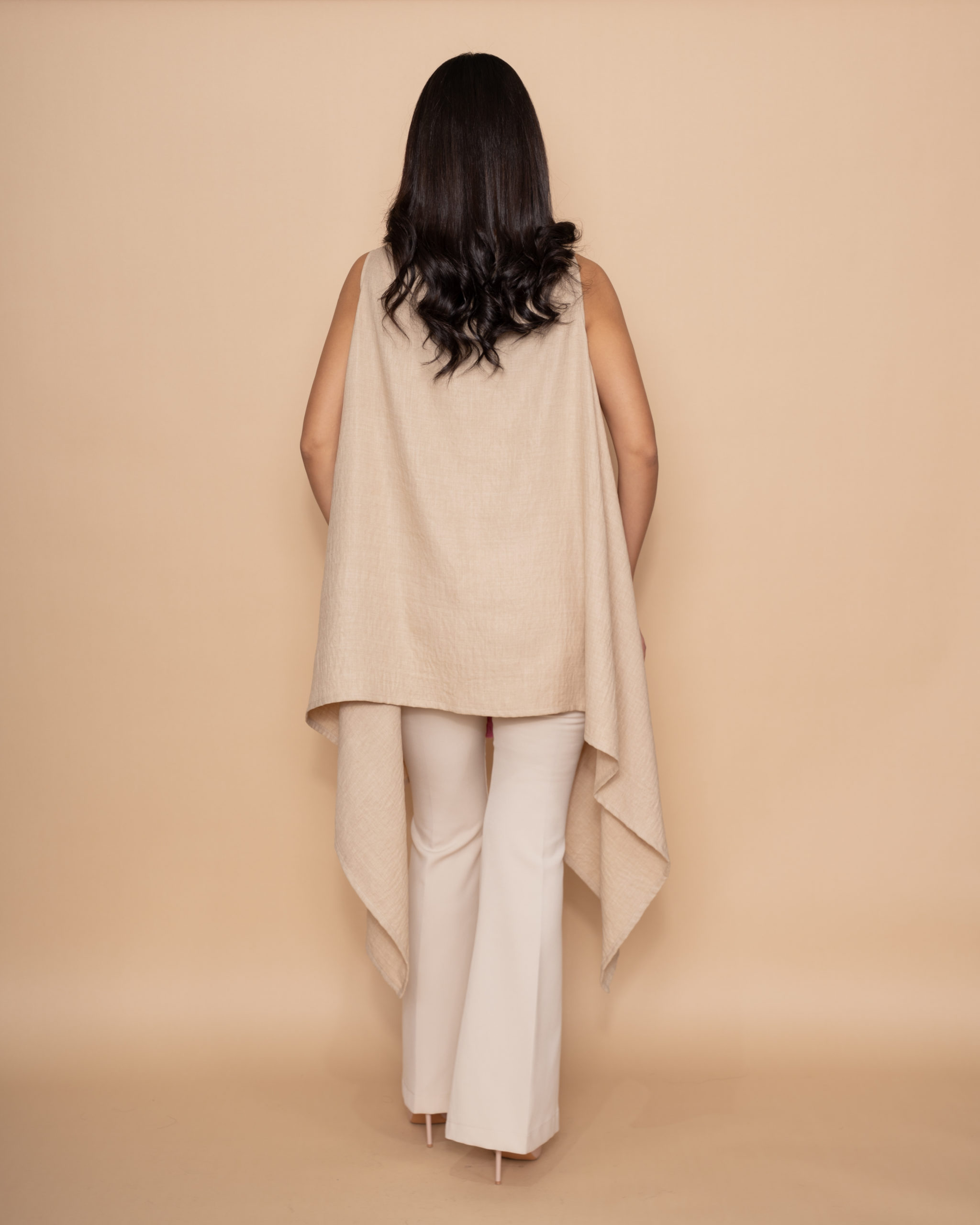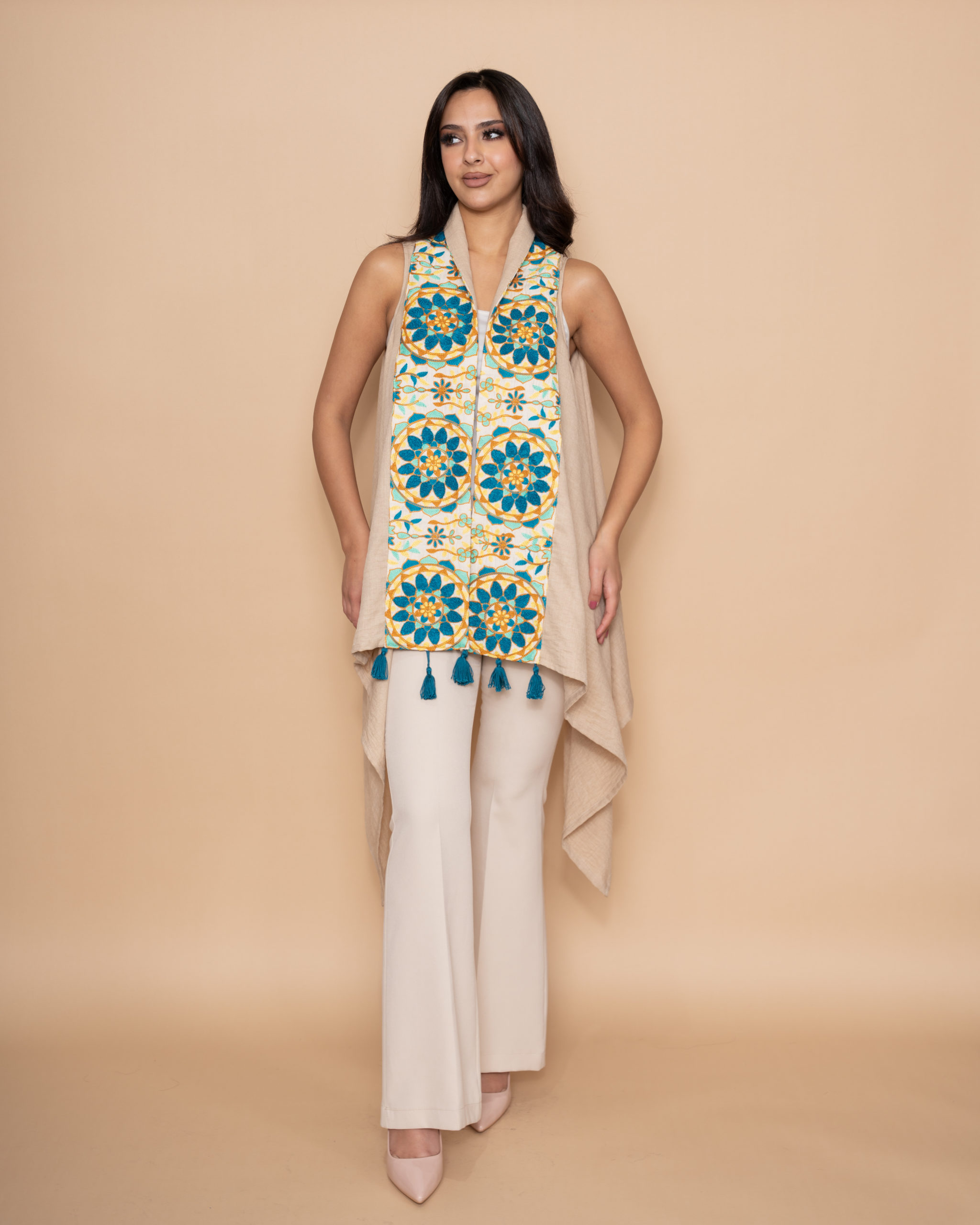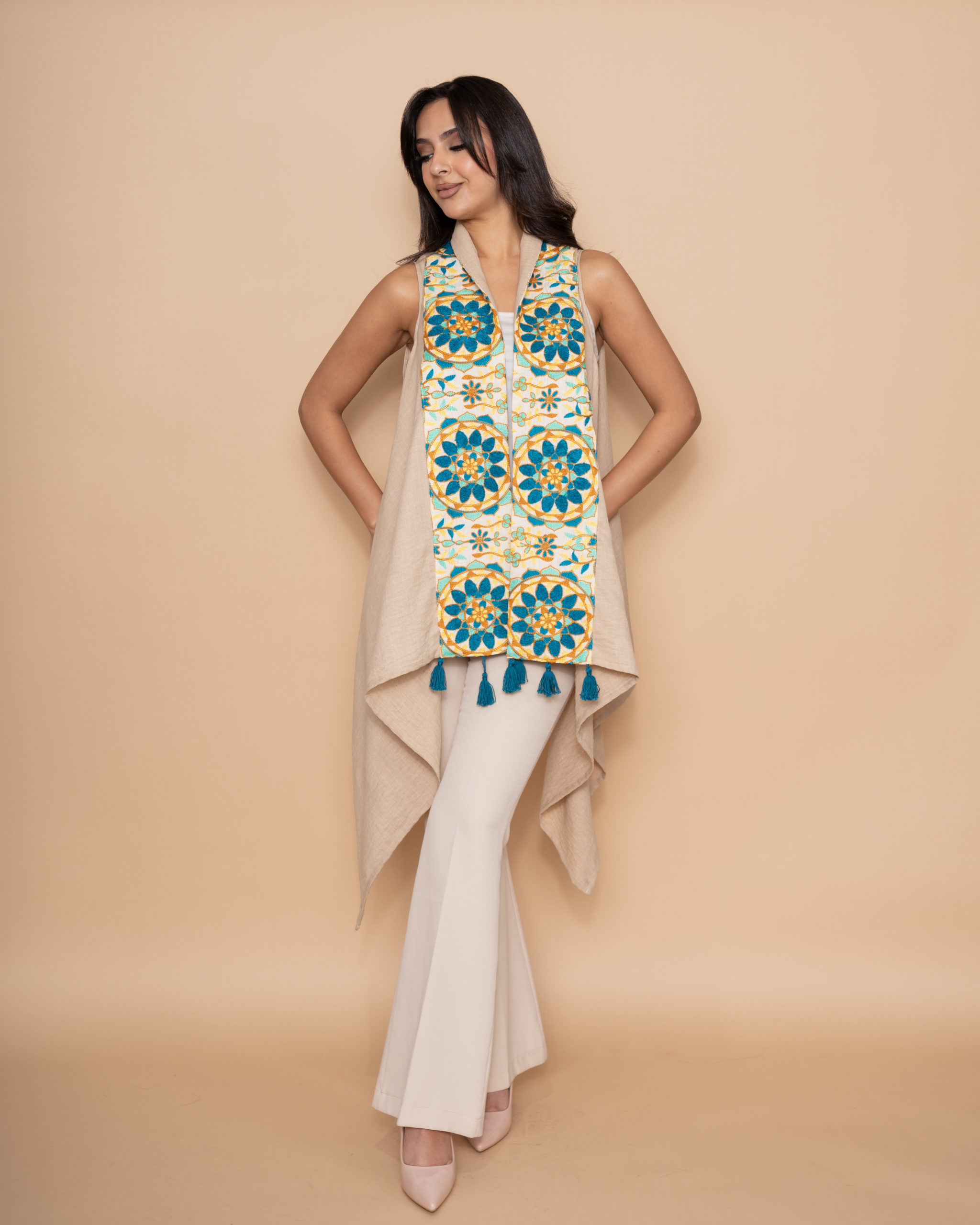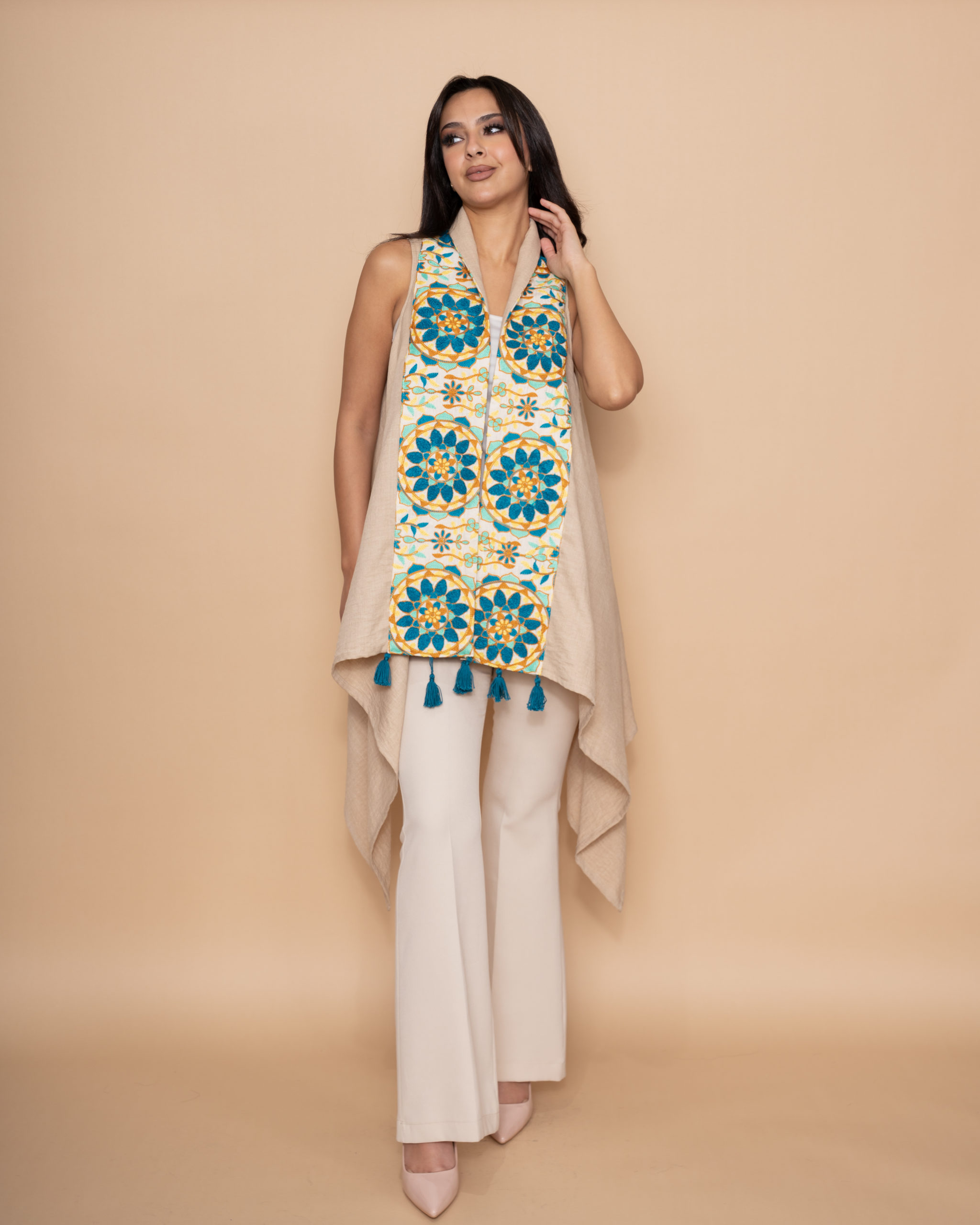 A modern beige linen vest, with yellow and turquoise 3D floral embroidery along the front panels, each side is beautifully finished with three handmade turquoise tassels.