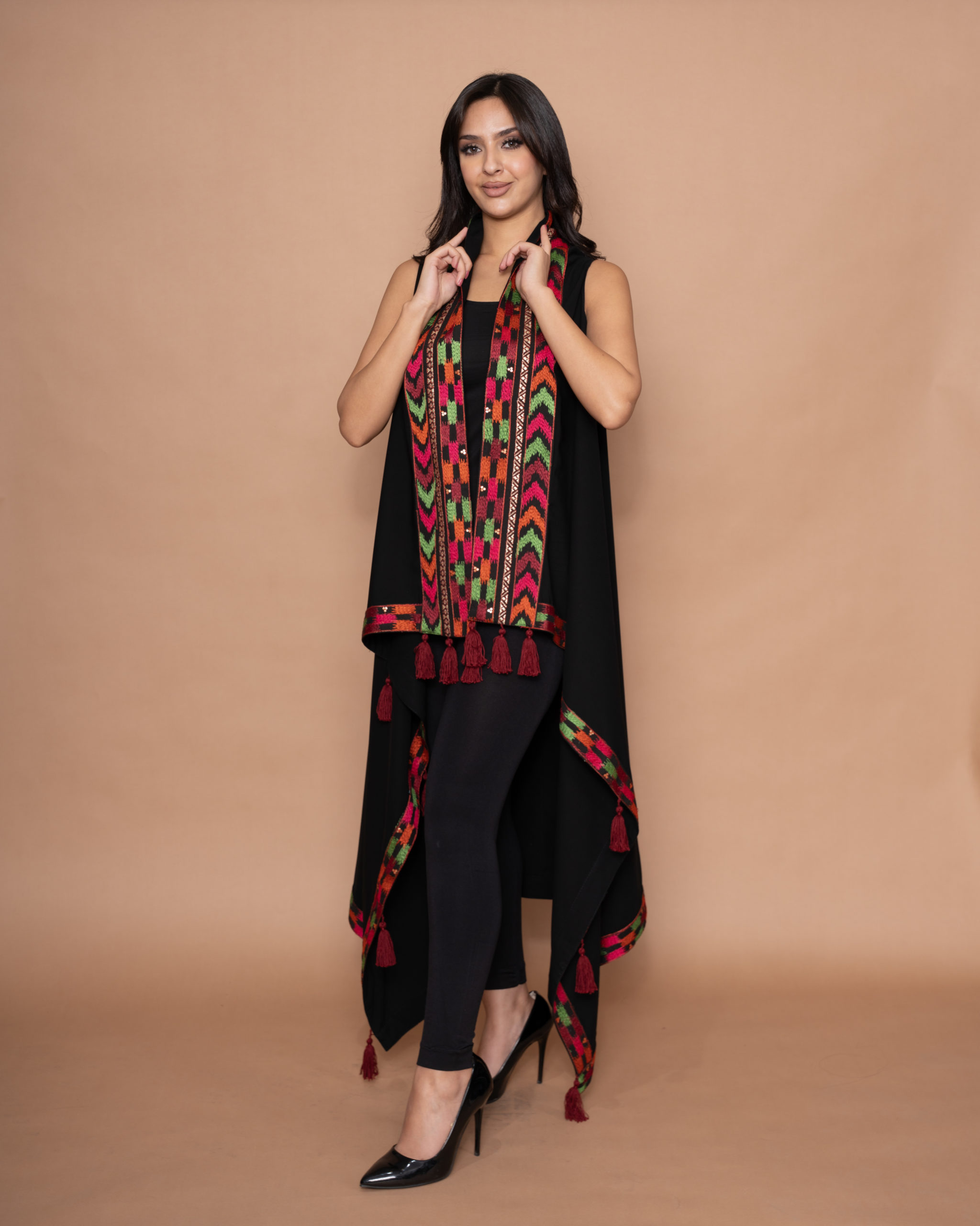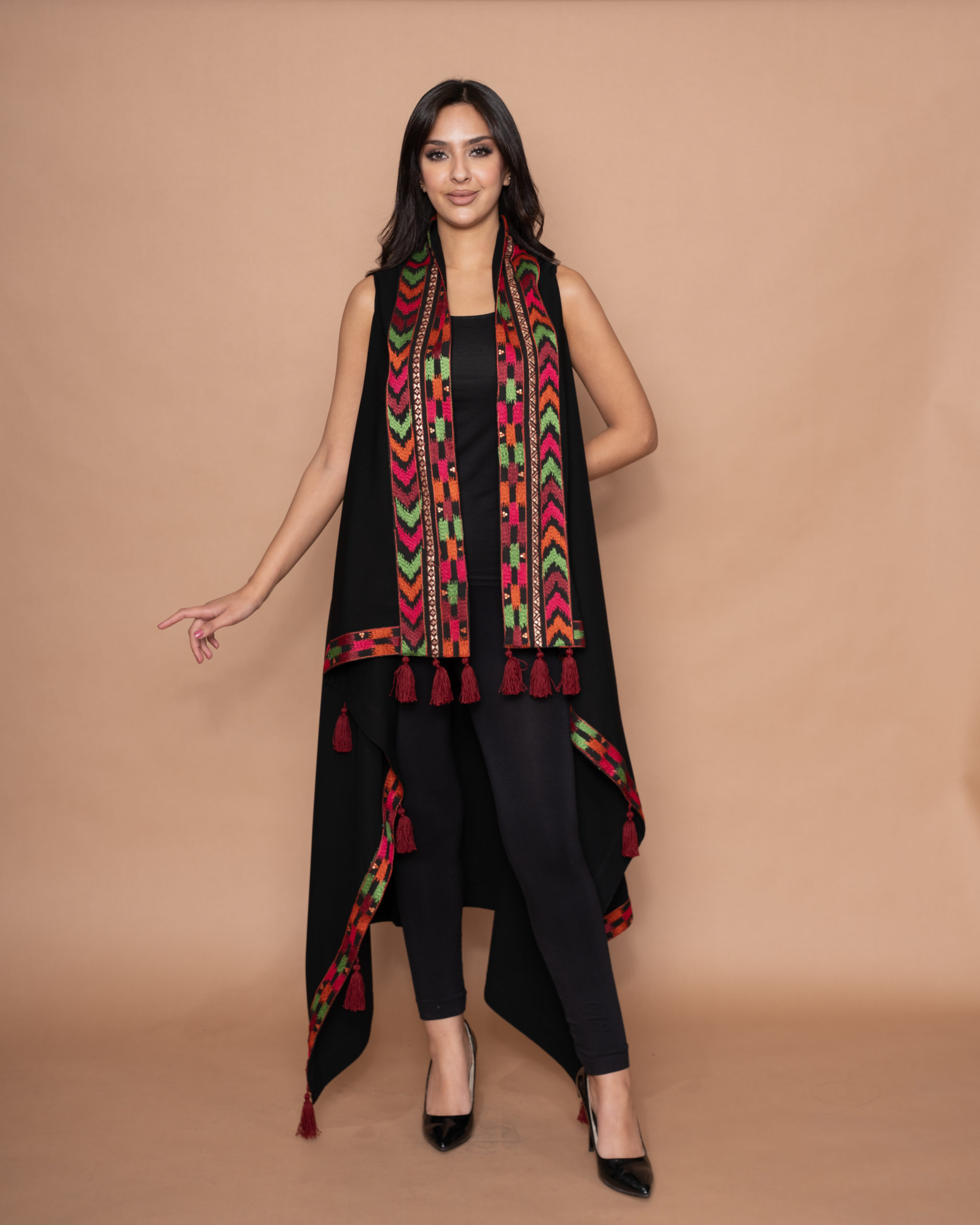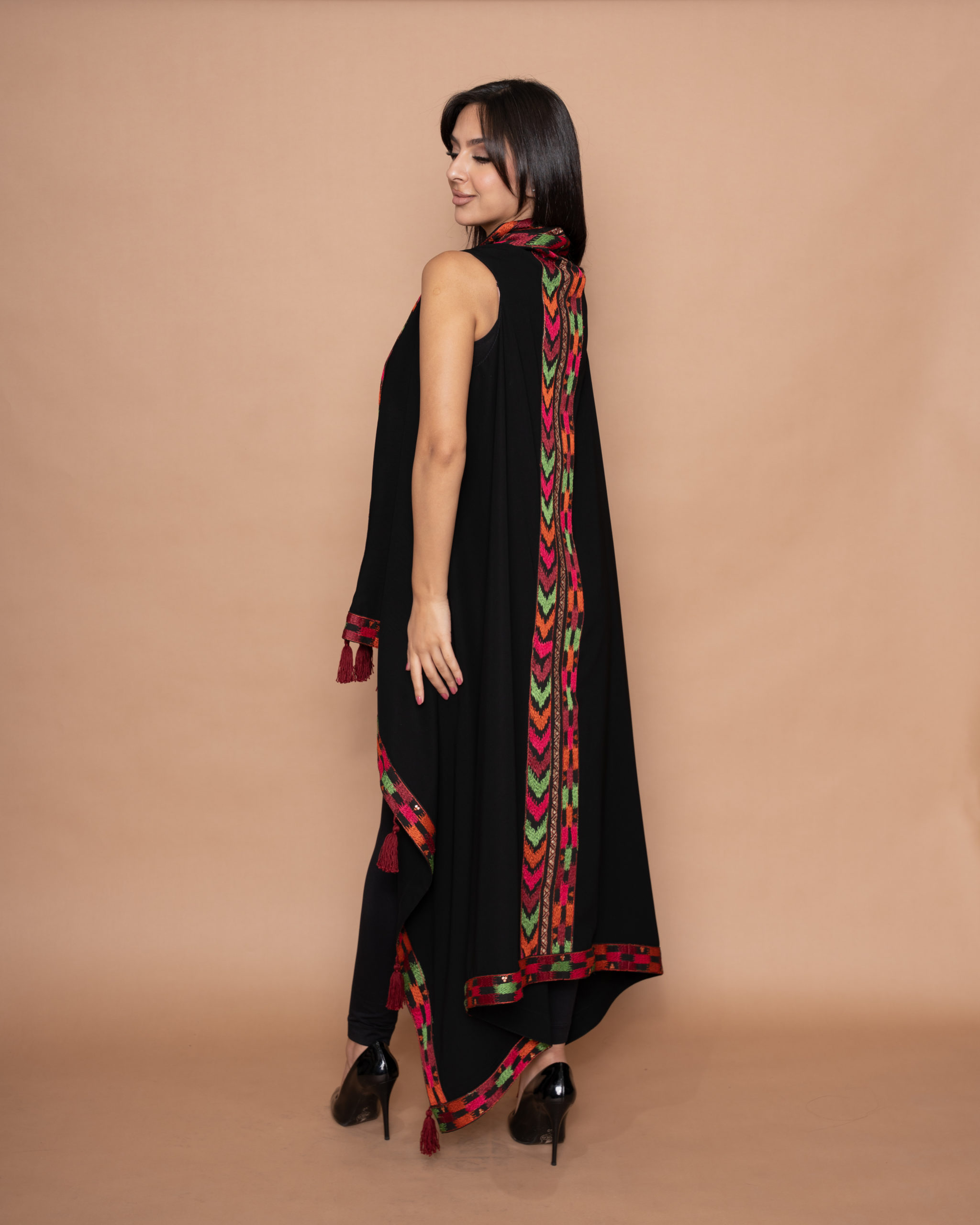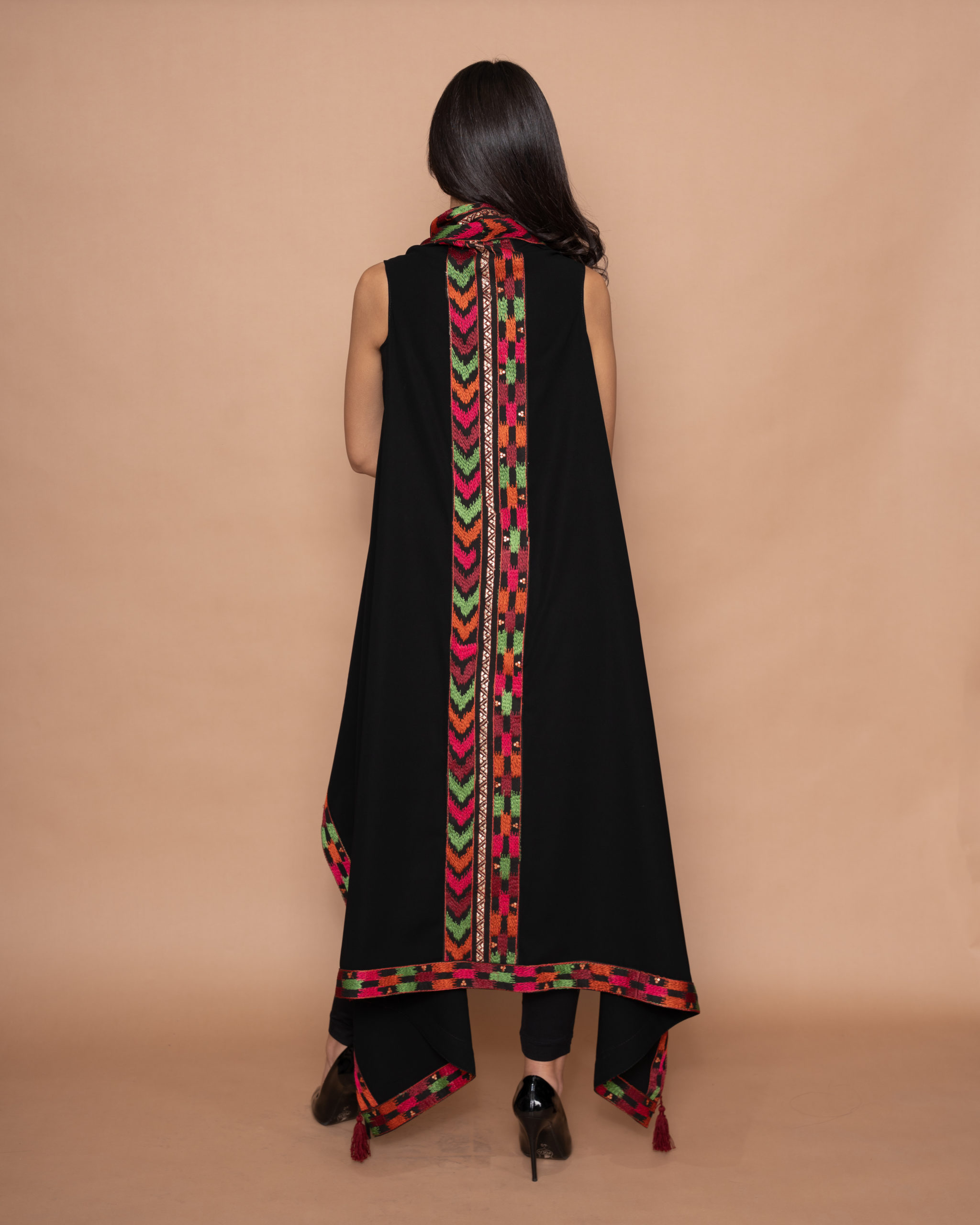 A beautiful black crepe long vest, designed with green, orange, red, and fuchsia arrow embroidery along the front panels, a vertical panel along the back, and all around the borders. Elegantly finished with burgundy handmade tassels on each side.
