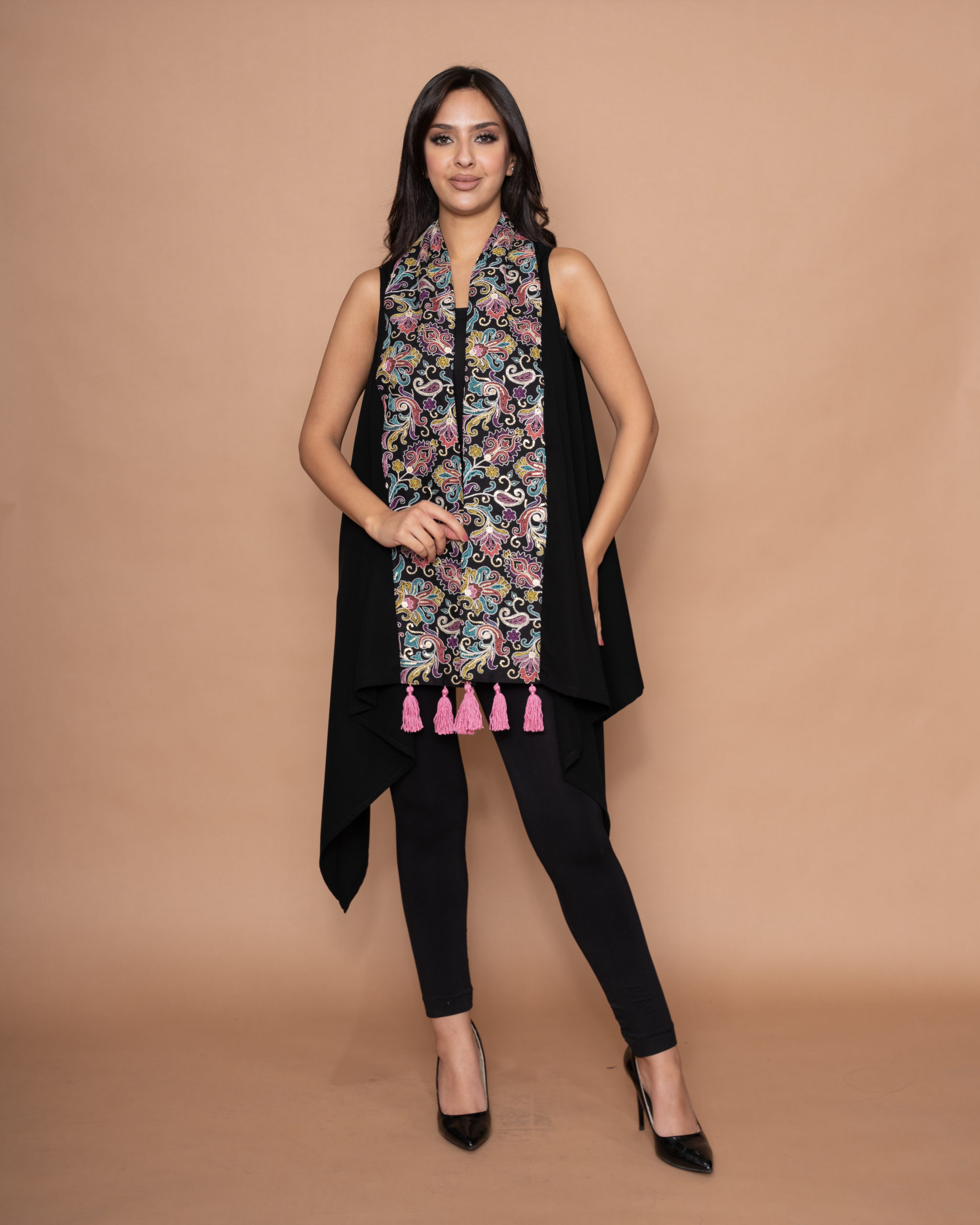 A beautiful black crepe vest, with floral embroidery in a soft palette of pink, purple, blue and white along the front panels. Elegantly finished with three handmade pink tassels on each side.