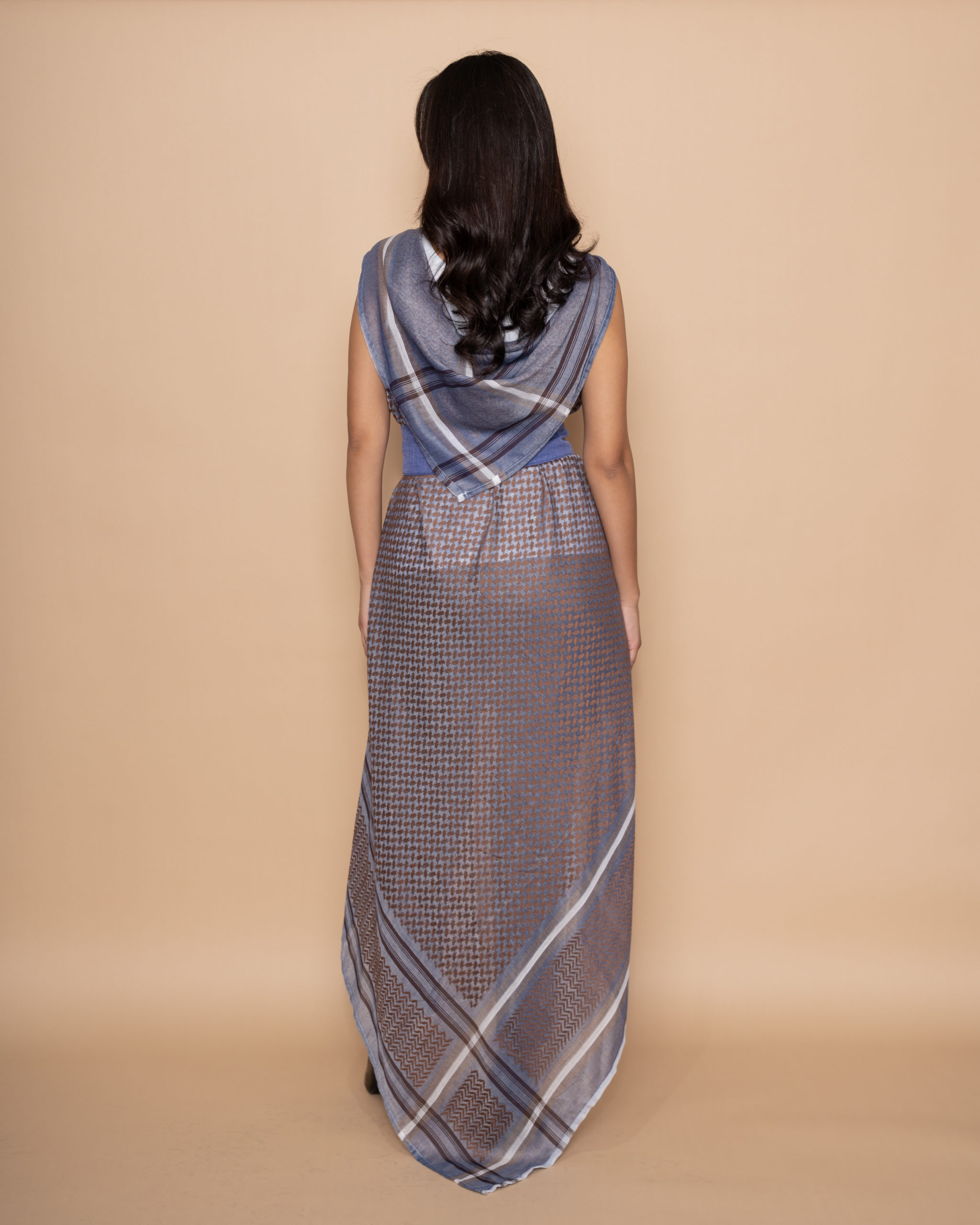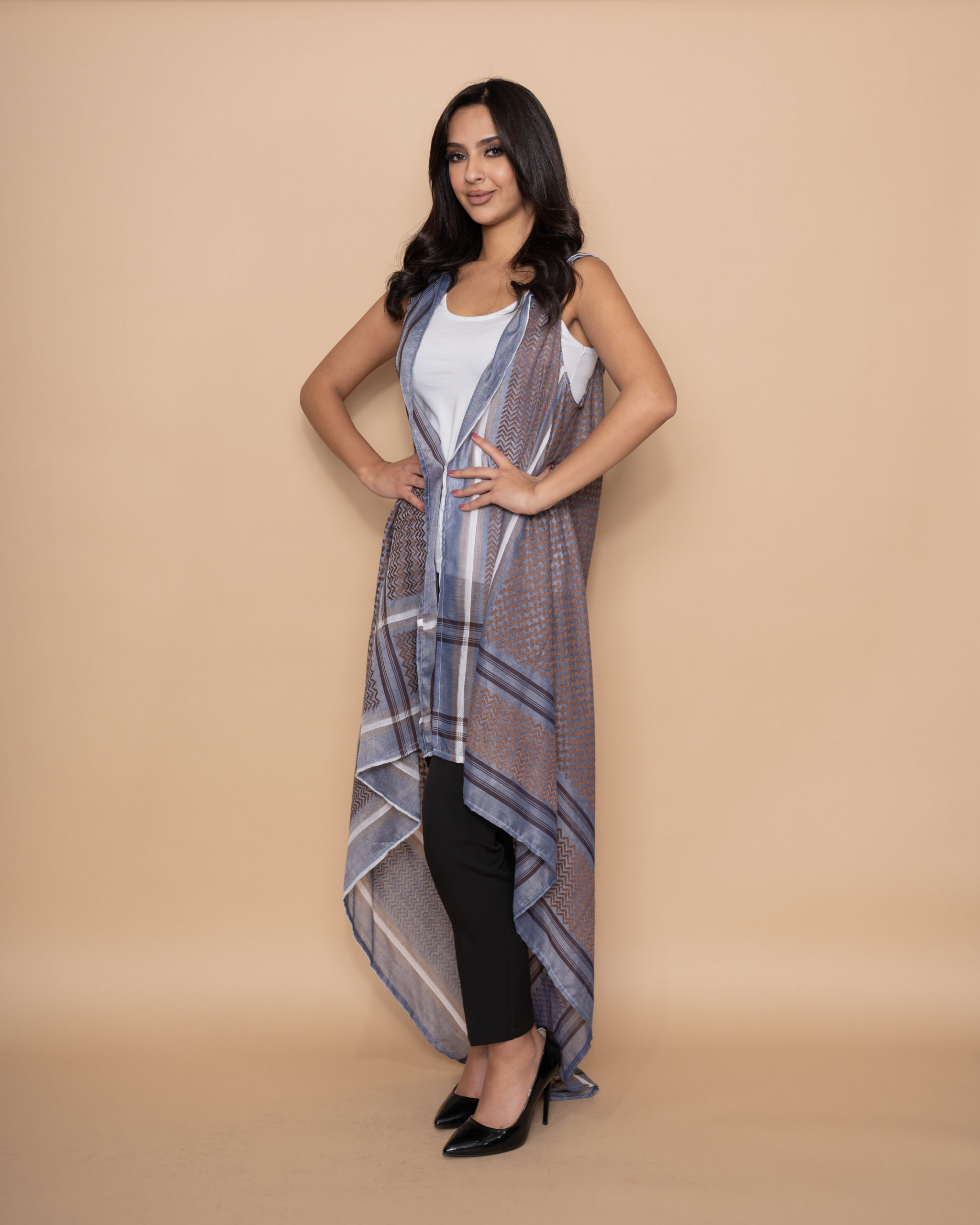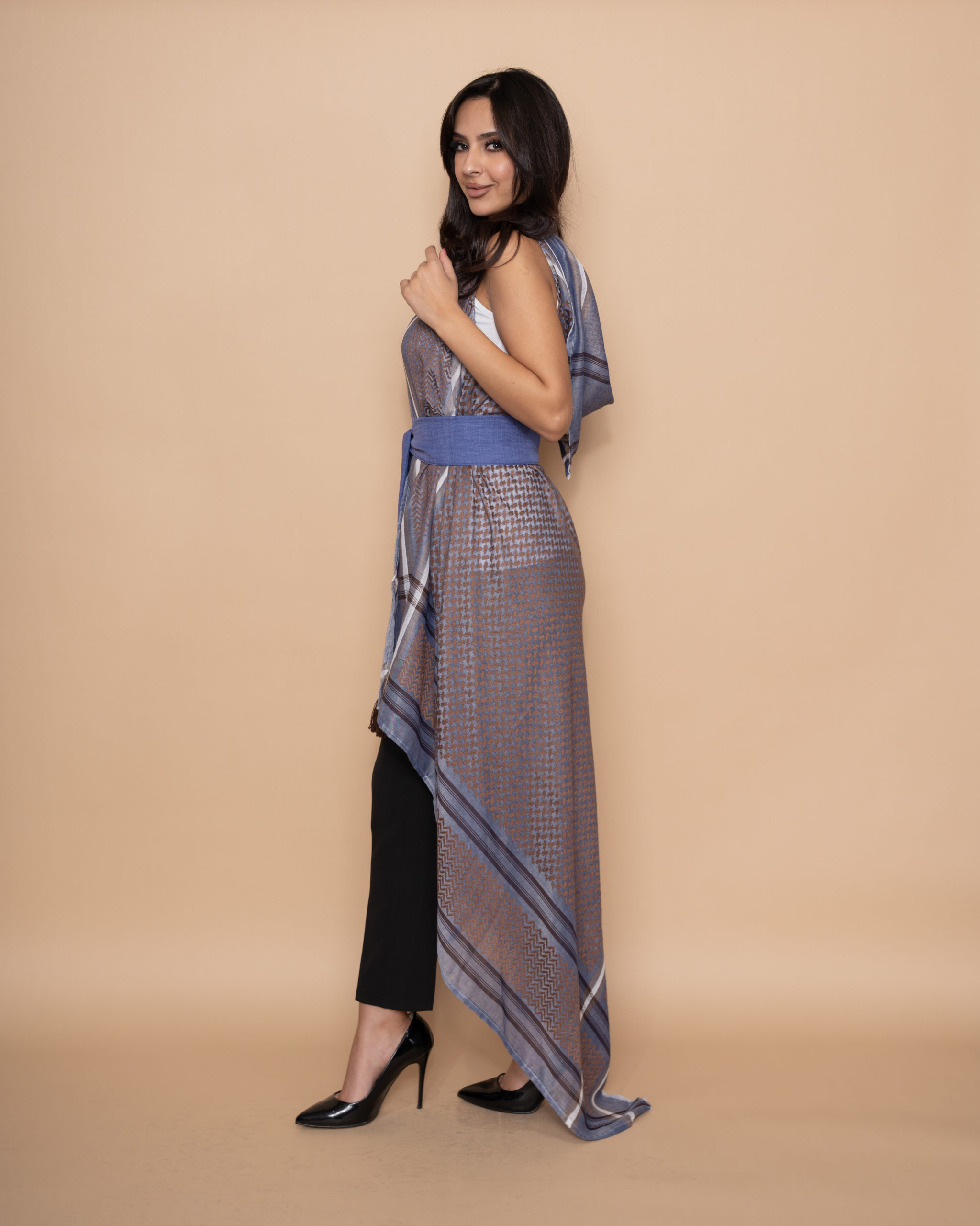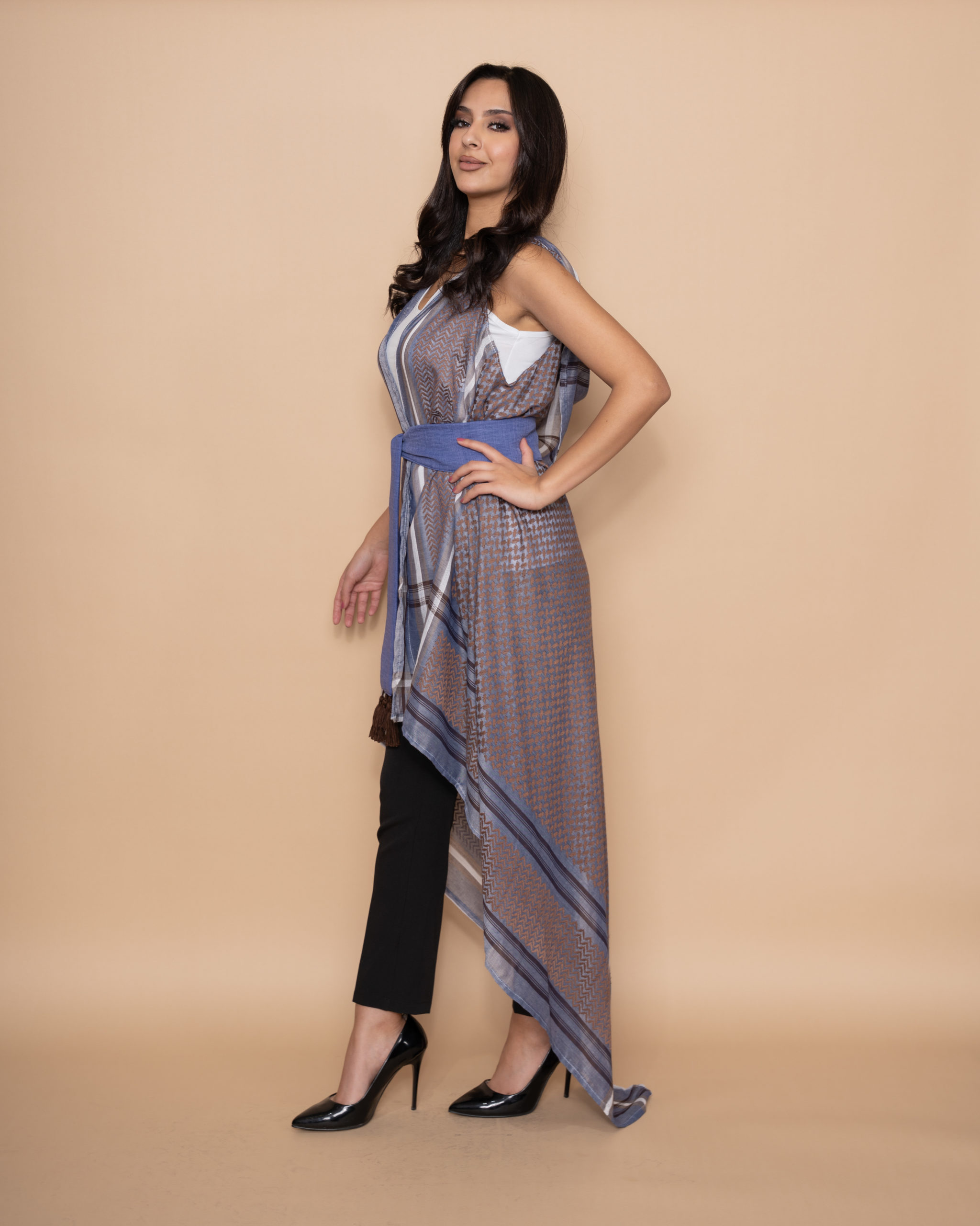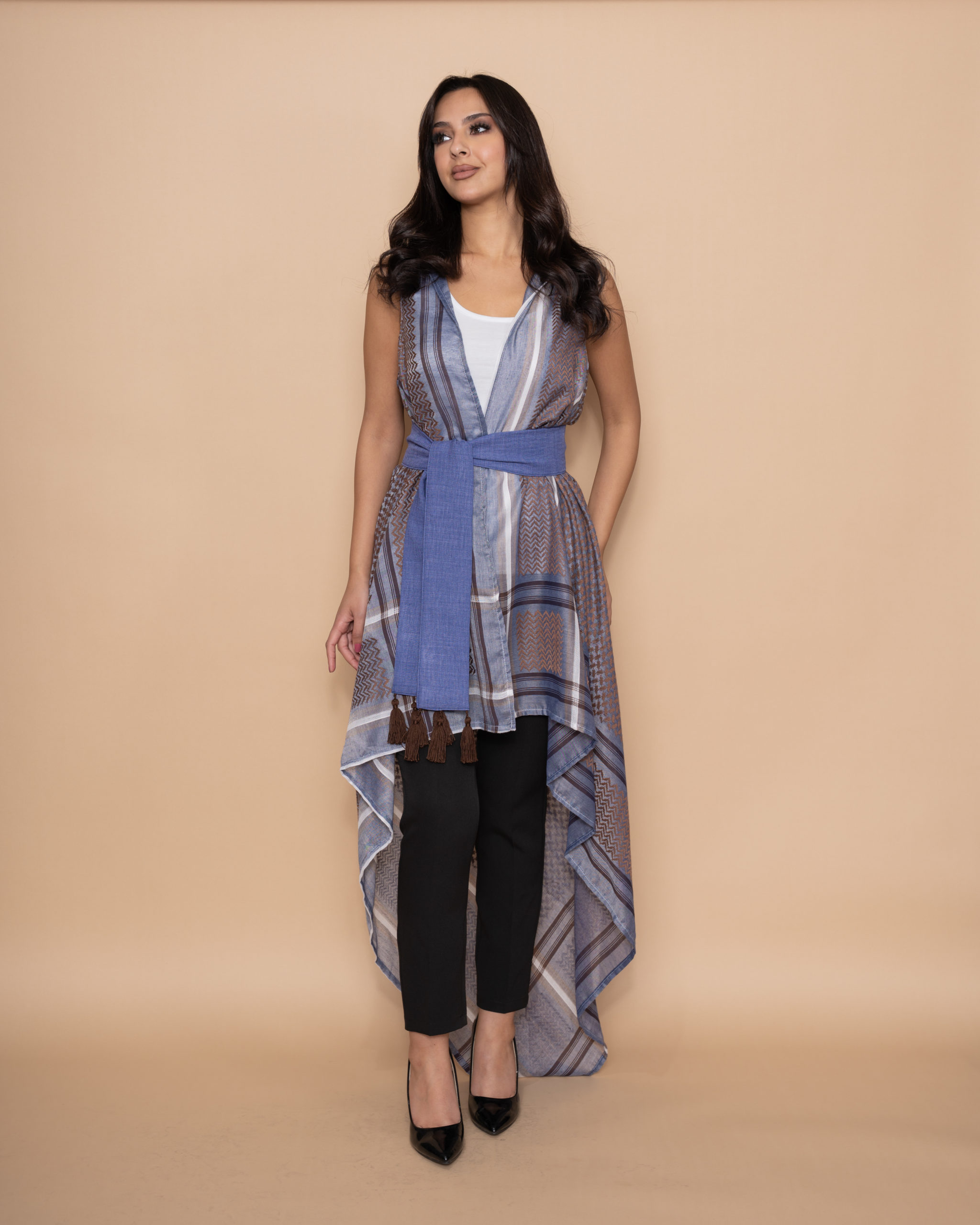 A modern blue and brown Hatta vest, featuring a wide blue waist belt with a hand made brown tassel endings, designed with a unique triangle back flow. This piece blends tradition with modern style.